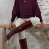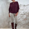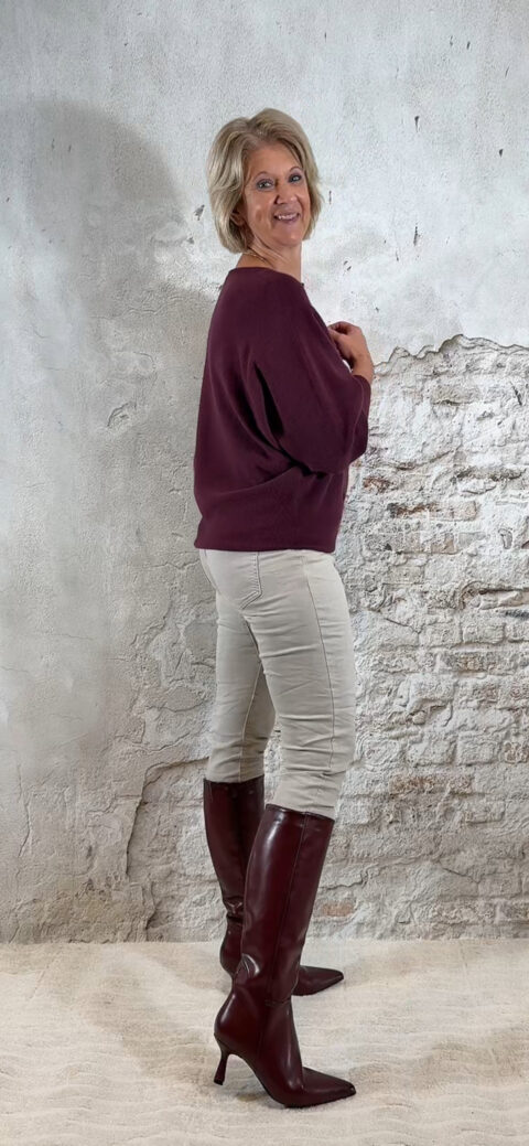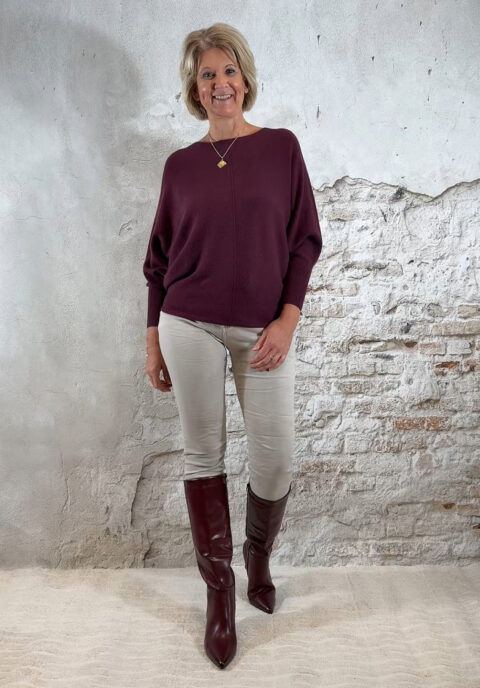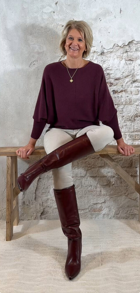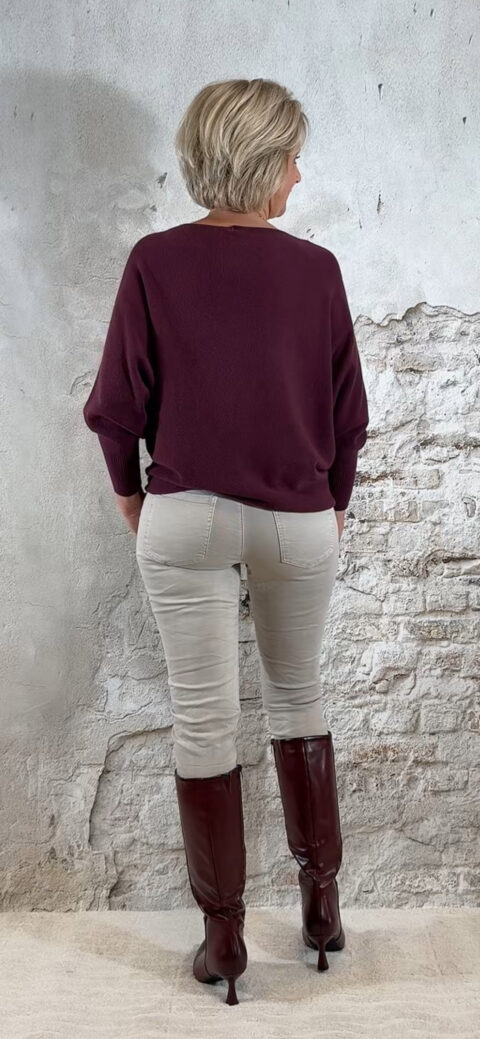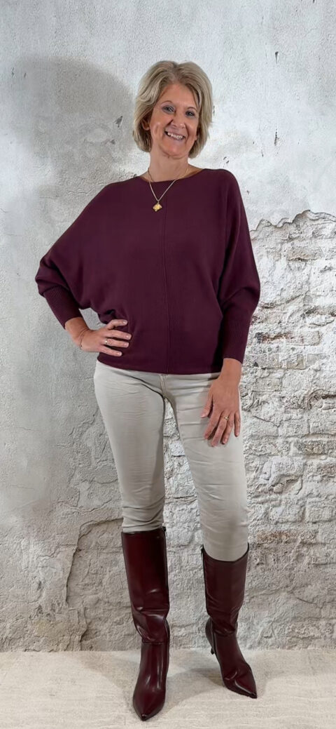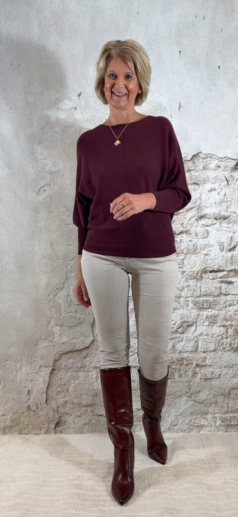 De Ailan Vlindertrui in bordeaux is een heerlijke, dikke en zachte knit die meteen een cozy en vrouwelijke uitstraling geeft. De brede vlindermouw-pasvorm valt soepel en elegant, terwijl de onderkant iets strakker is zodat je de trui mooi kunt blousen voor een elegante, flatterende fit.