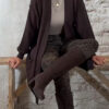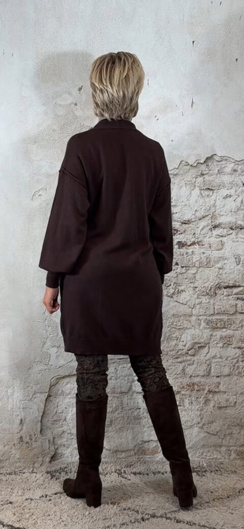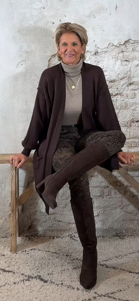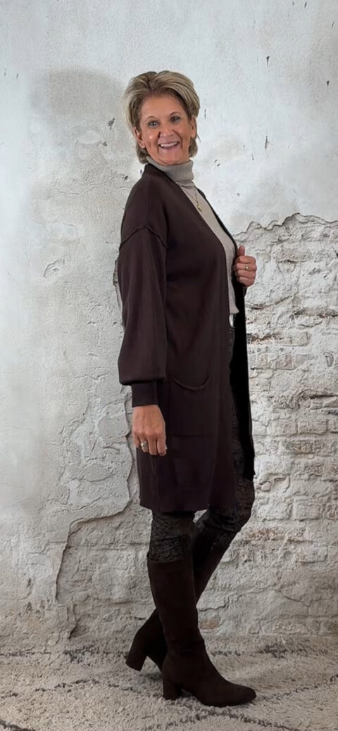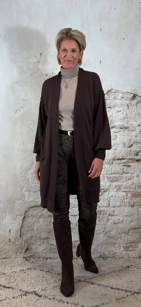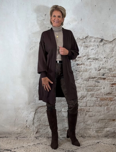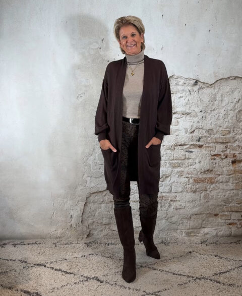 De mouwen zijn afgewerkt met een nonchalante ribbelrand – alsof je de binnenkant ziet – dat geeft het vest net dat beetje extra en een relaxte look. Verkrijgbaar in bruin en beige.
