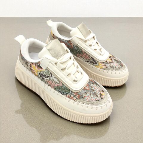 De Cleo sneaker is een echte blikvanger met zijn unieke ingeweven motief. Het patroon geeft de sneaker een stijlvolle, almost bohemian touch, terwijl de witte zool met contraststiksels zorgt voor een moderne, sportieve uitstraling.
