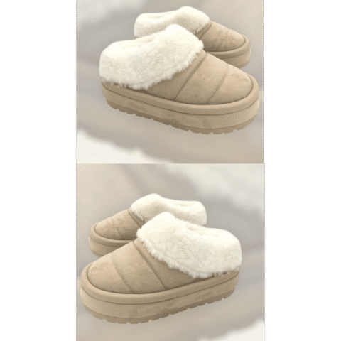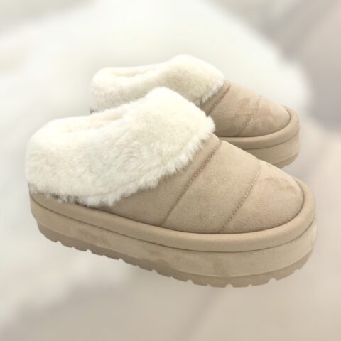 Zachte UGG-style pantoffels met dikke zool, fluffy teddyvoering en padded suedine bovenkant. Verkrijgbaar in beige en taupe. Maten 36 t/m 41.