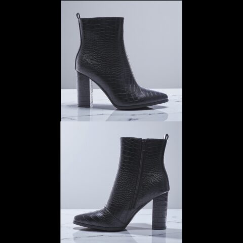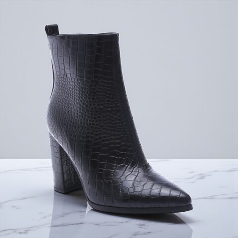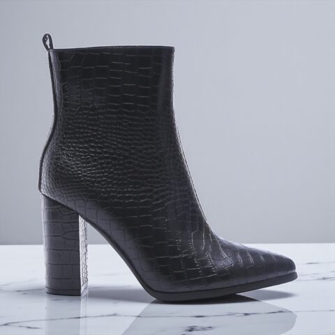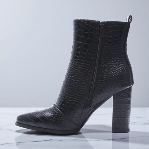 Enkellaars met croco-structuur van eco leather, puntneus en hoge hak.