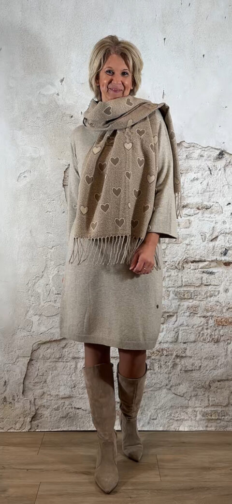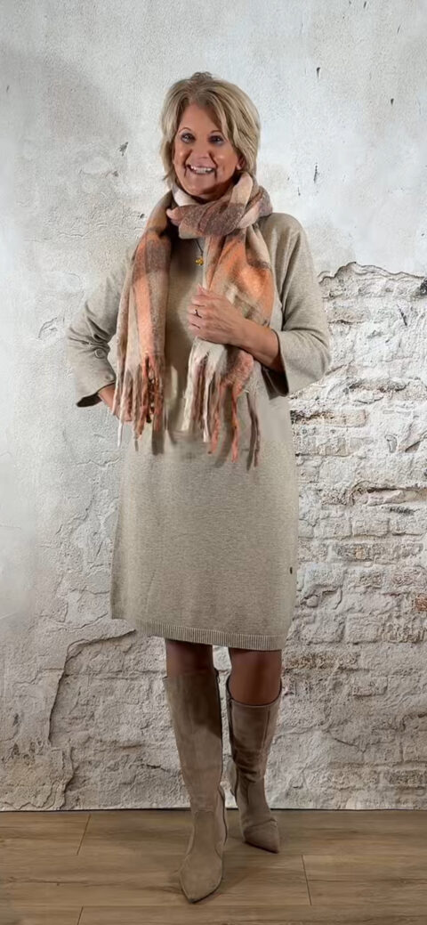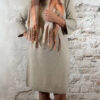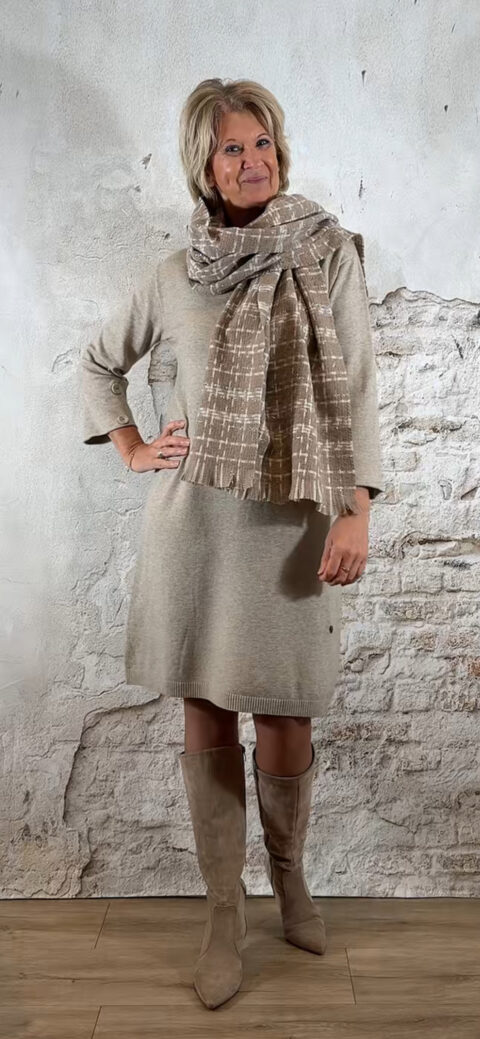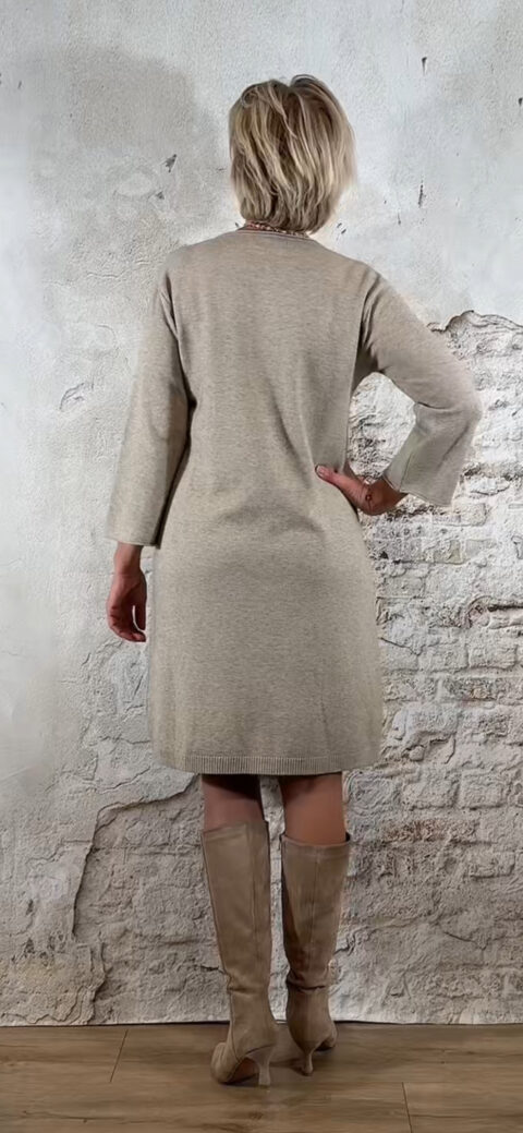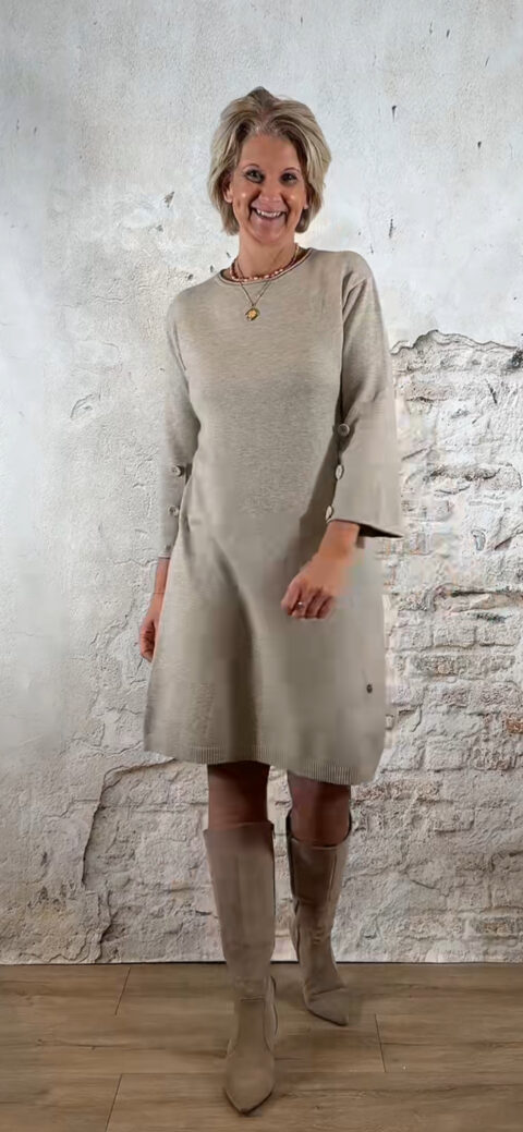 De Elza Knit Dress met knopen in zand is zo’n heerlijke zachte jurk waar je direct in wilt wonen, maar die tegelijk nét dat vrouwelijke, verzorgde gevoel geeft.