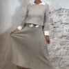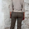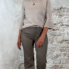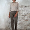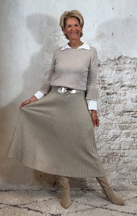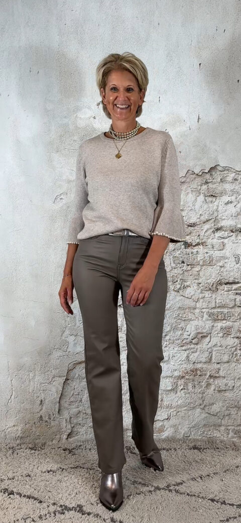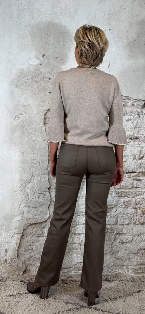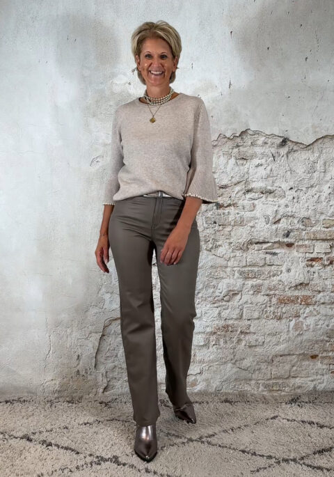 De Elza pullover in zand is een elegant truitje met een speels detail. De trompetmouwen zijn afgewerkt met een parelrandje, waarbij de parels stevig door de stof heen zijn gestud – ze blijven dus mooi op hun plek.