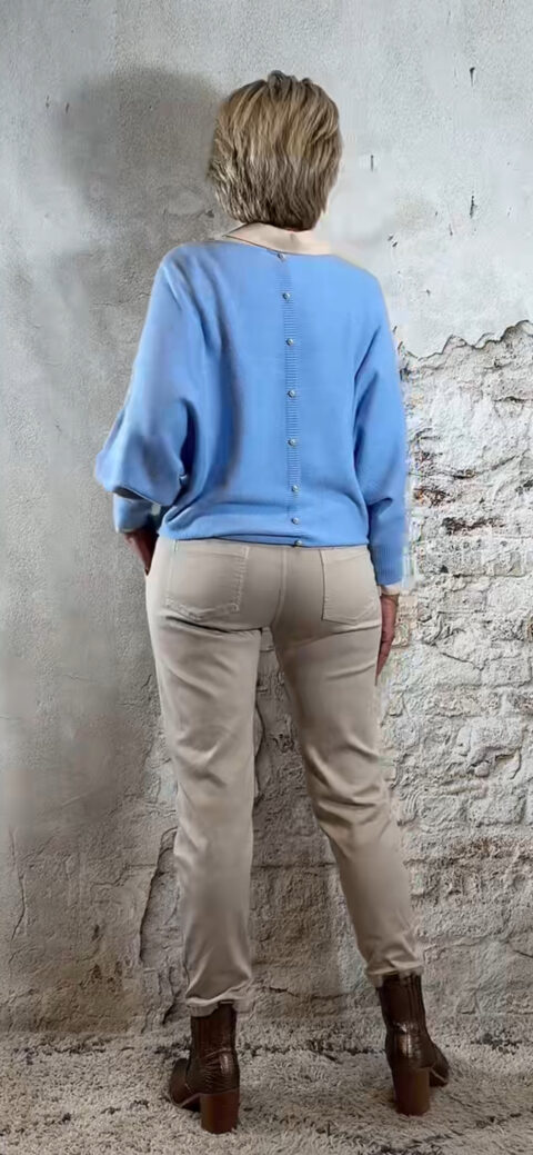 Met wijde mouwen die smal toelopen en een aansluitende onderkant die zorgt voor een mooie bloezende look, valt hij soepel over je buik – ideaal als je dat net wat wilt camoufleren. Achterop, midden over de rug, zit een verticale rij subtiele pareltjes voor een chique touch.