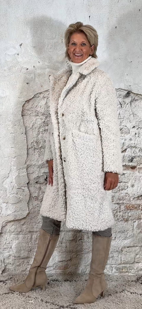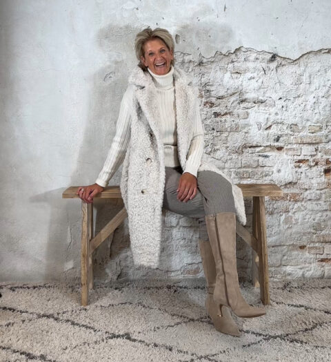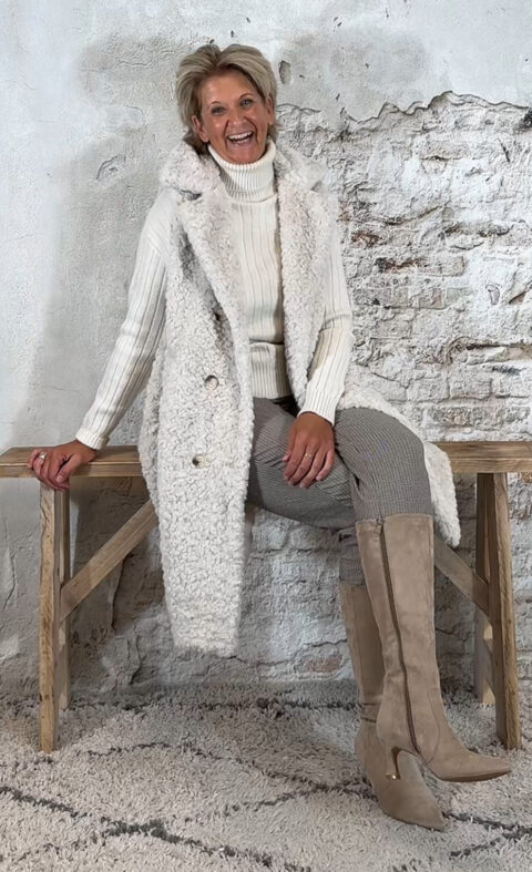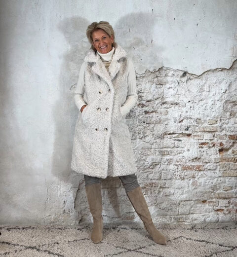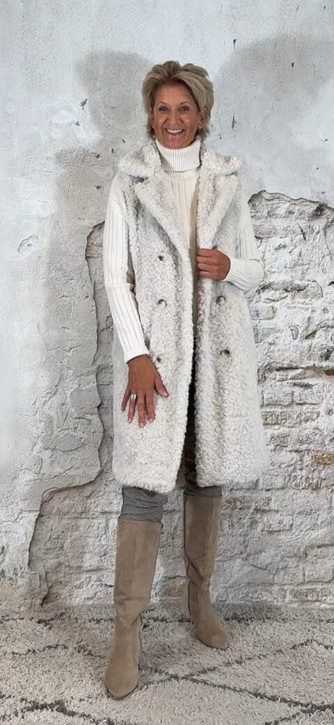 De Evy fake fur lange bodywarmer in winter wit is hét statement item van dit seizoen. De luxe fake fur stof voelt heerlijk zacht aan en geeft je look een warme, chique uitstraling. Met de lange lengte, reverkraag en knoopsluiting draag je deze bodywarmer zowel open als dicht – ideaal om te combineren over een trui, blouse of jurk.