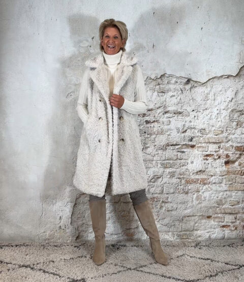 Evy lange bodywarmer in winter wit van fake fur. Gevoerd, met reverkraag, zakken en knoopsluiting. One size 38 t/m 42. Prijs: €99,95.
