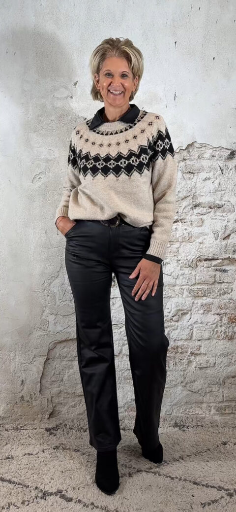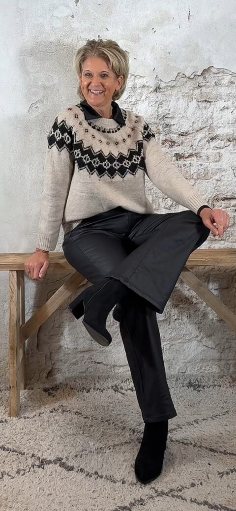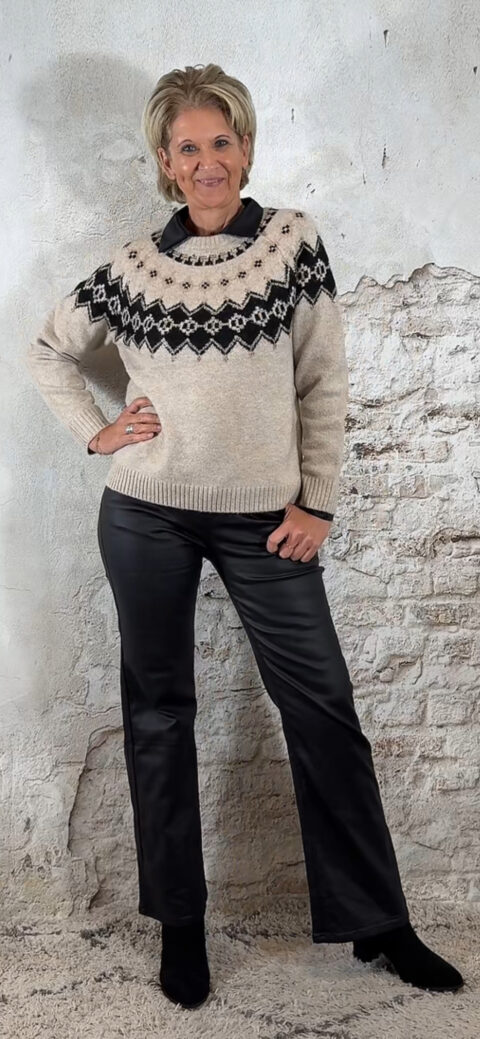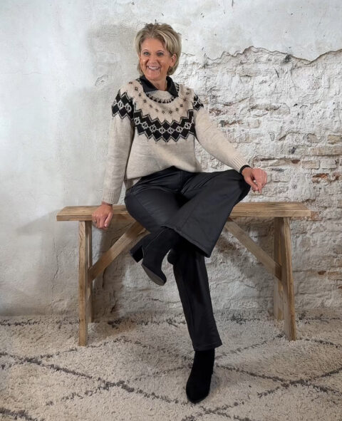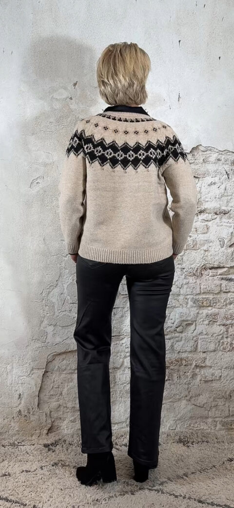 De Evy Noorse trui is een warme knit met een klassieke uitstraling. Rondom de hals is de trui versierd met een Noorse print, subtiel afgewerkt met kleine strass steentjes die voor een chique detail zorgen.