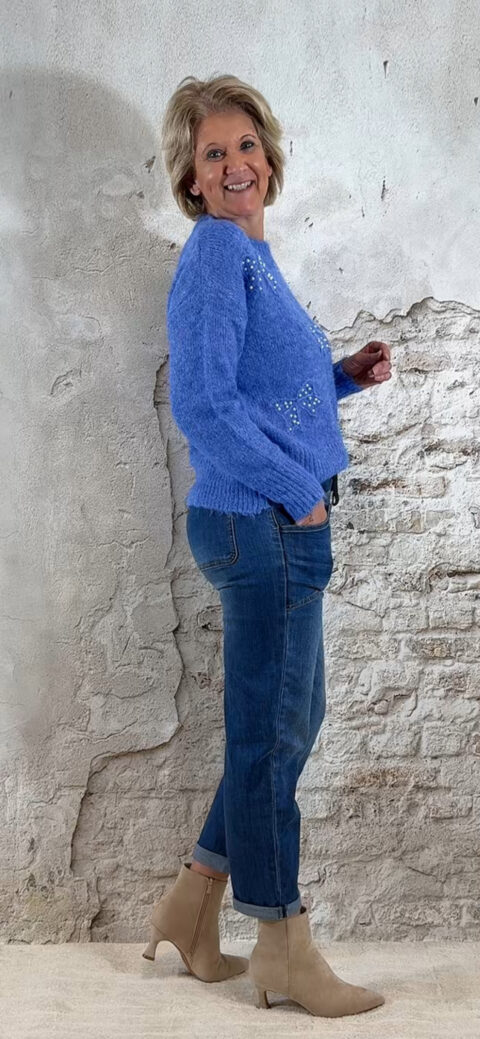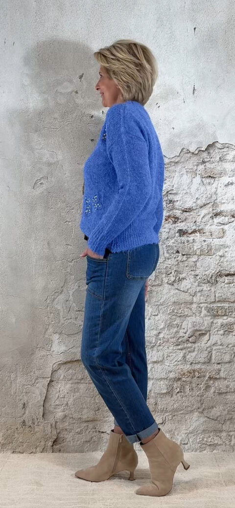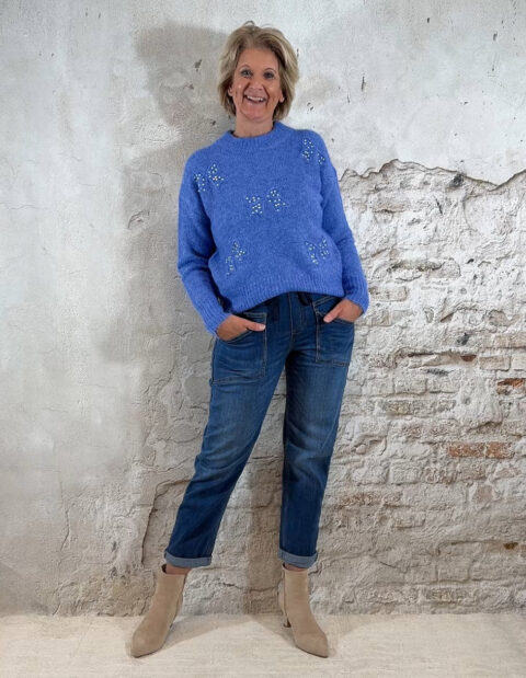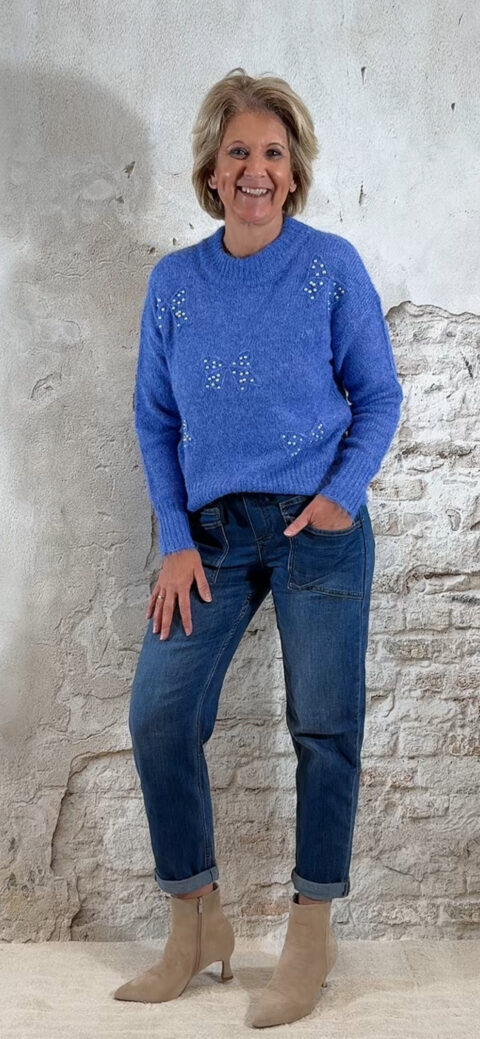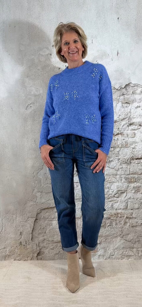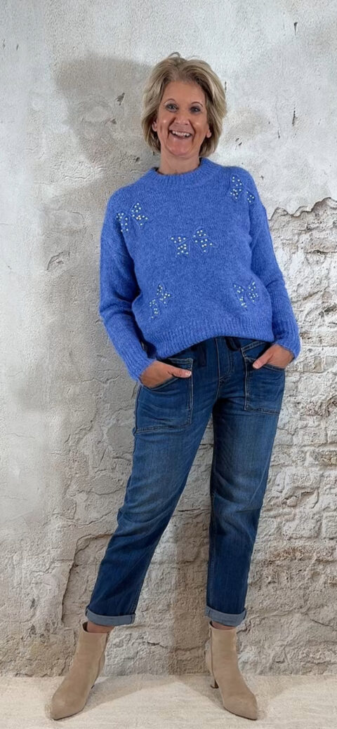 De Evy Pullover Pearl Bow in blauw is die perfecte mix van feestelijk én casual. De gemêleerde blauwe tint geeft een zachte, luxe uitstraling, terwijl de strikjes met pareltjes op de voorkant een chique, vrouwelijk detail toevoegen. Ideaal voor feestdagen, een etentje of als mooie everyday knit.