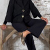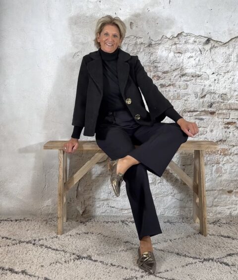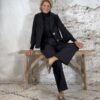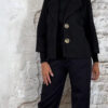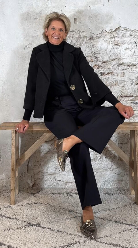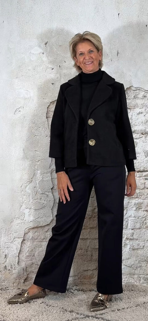 Het Evy A-lijn wollook jasje in zwart is een elegante toevoeging aan je garderobe. Het licht uitlopende A-lijn model en de subtiel wijder vallende mouwen zorgen voor een vrouwelijke pasvorm. De reverskraag, steekzakken en de prachtige grote gouden knopen maken het jasje helemaal af.