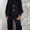 Zwart A-lijn wollook jasje met reverskraag, steekzakken en grote gouden knopen. One size, geschikt voor maat 36 t/m 40.