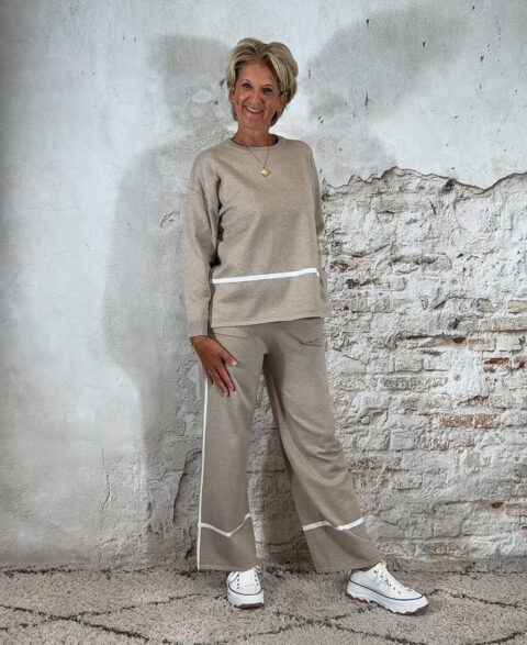 De Nova gebreide broek in zand is de perfecte combinatie van comfort en stijl. Deze lounge broek heeft een sportief-chique uitstraling dankzij de subtiele ecru strepen en het strakke design. De ingebreide zakken geven een speels en praktisch detail.