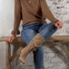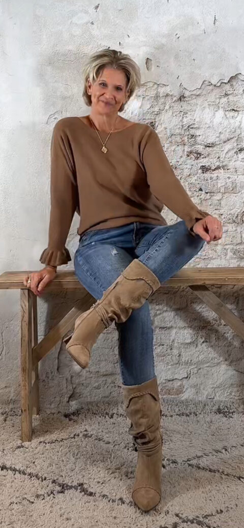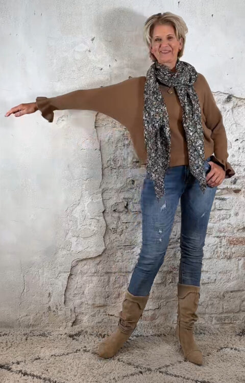 Door de toelopende onderkant valt hij daar mooi aangesloten en kun je hem makkelijk blousen of ook dragen op een rok, jurk of hoge broek.