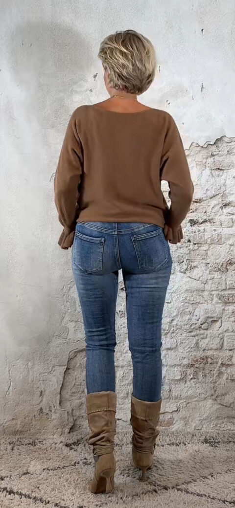 Deze trui heeft een lichte vlindermouw met een elegante ruffle aan de uiteinden en een ruime ronde hals die mooi valt.