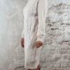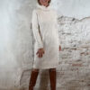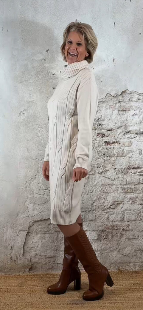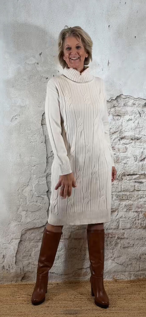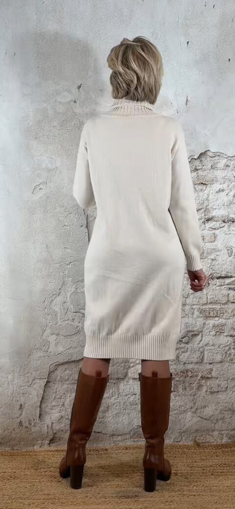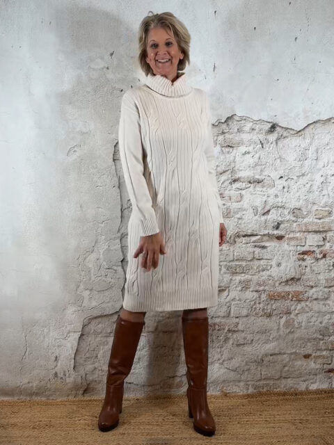 Buttermilk kabeljurk met zachte ribbelcol. Warm, vrouwelijk en comfortabel.