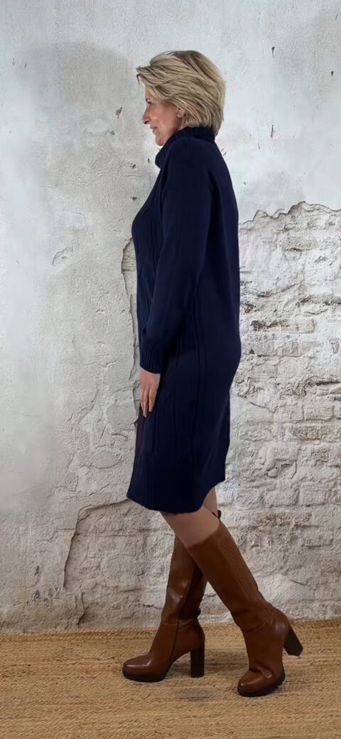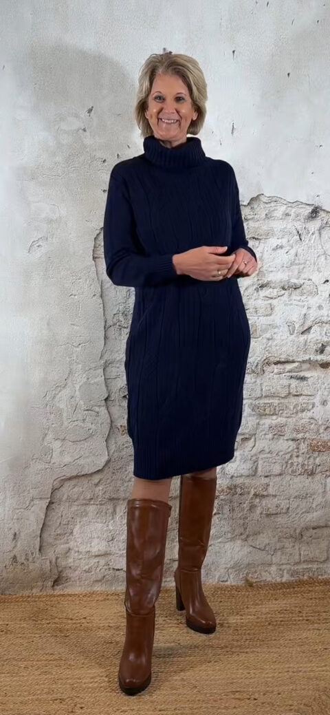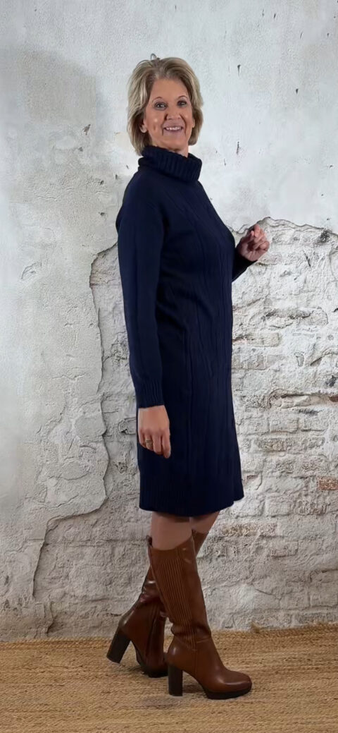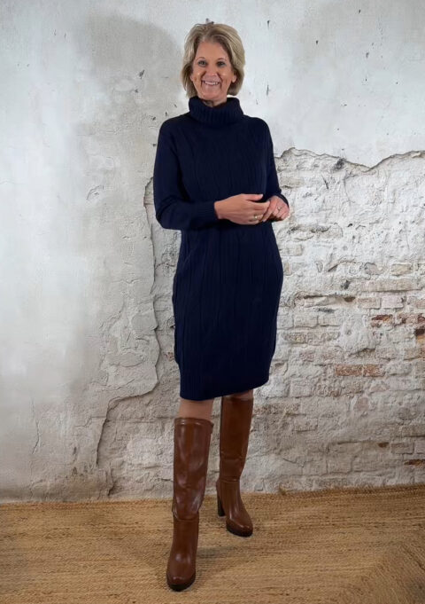 Donkerblauwe kabeljurk met ribbelcol. Warm, soepel en comfortabel.