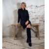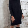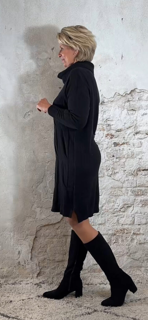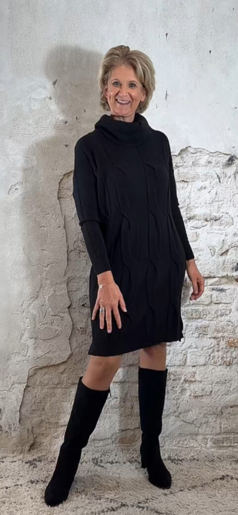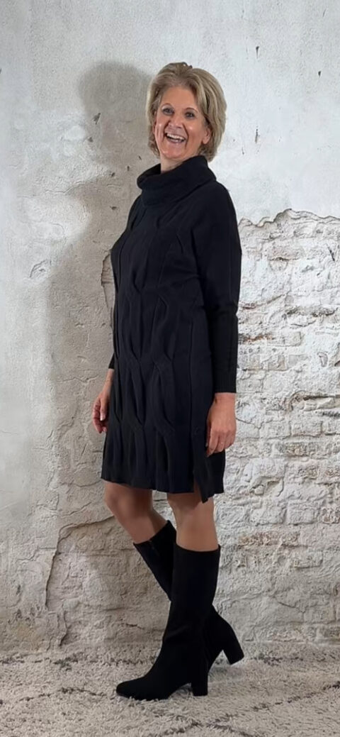 De Juul Gebreide Kabeljurk met Wafelcol Zwart is een warme, elegante trui-jurk met een luxe uitstraling. De voorkant heeft grove kabels, de achterkant is glad voor een slank silhouet. De zachte wafelcol zorgt voor een comfortabele, vrouwelijke look. De kleine splitten aan de zijkant maken het model speels en flatterend.