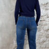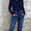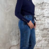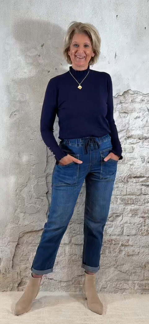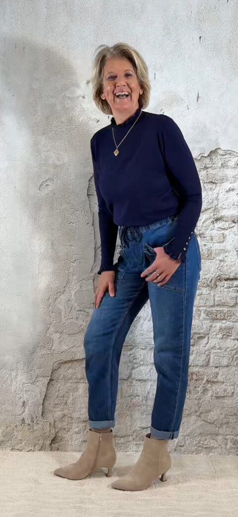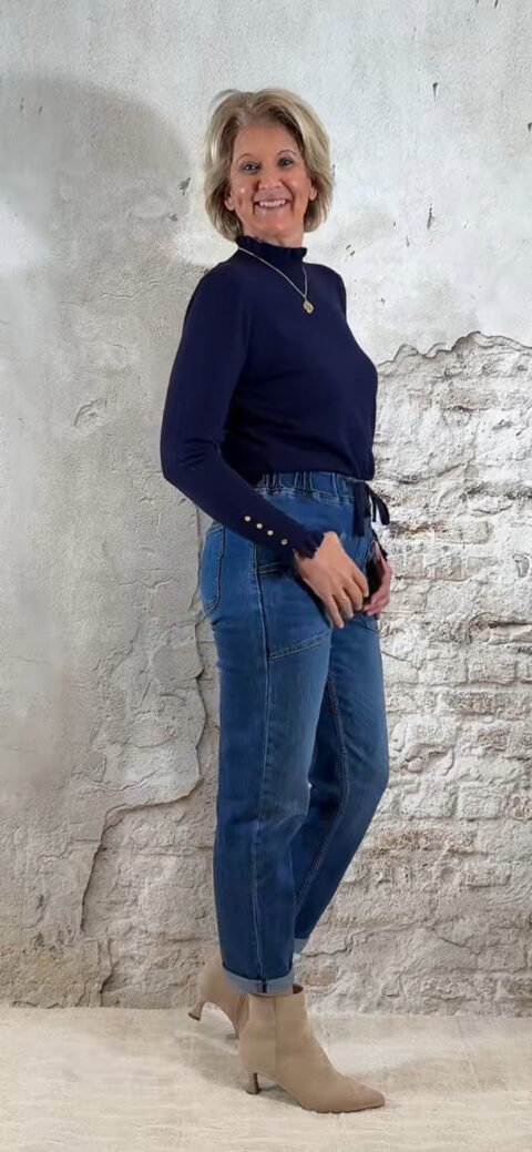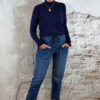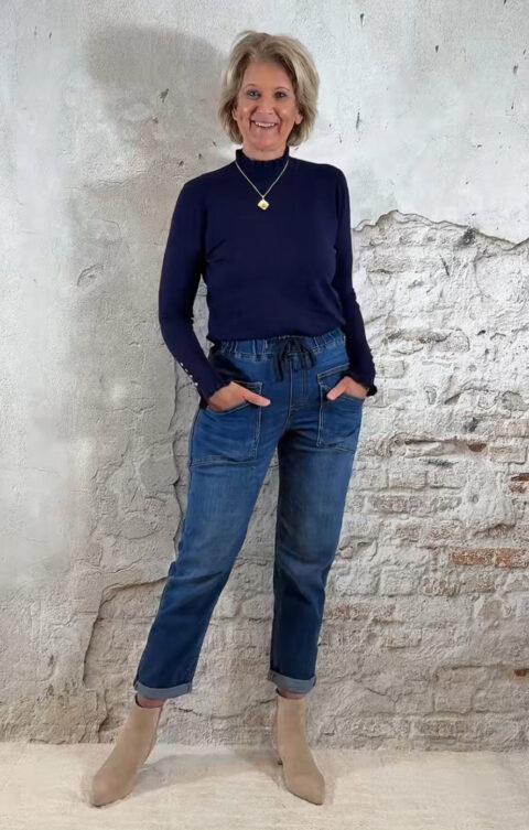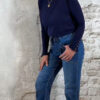 Donkerblauw turtle truitje met ruffles aan hals en mouwen, en vier goudkleurige knoopjes op de mouwen.