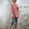 De ronde hals en nonchalante afwerking geven de trui een ontspannen look, terwijl de licht ronde onderkant zorgt voor een speels en flatterend effect.