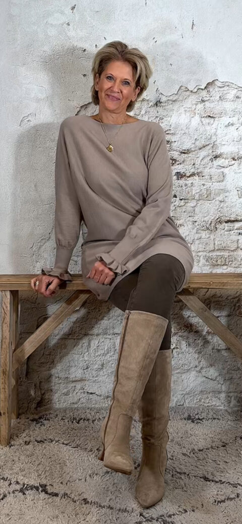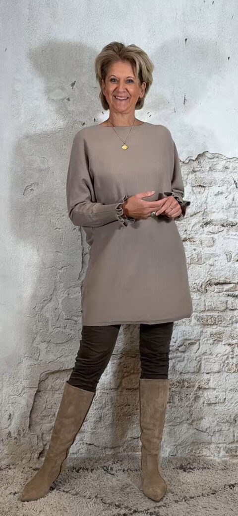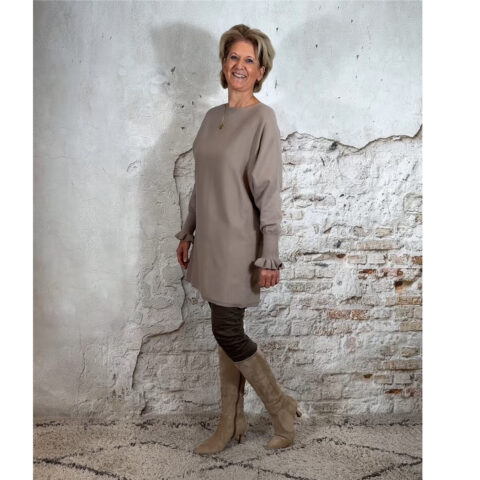 De Steffy Tuni Trui in taupe is een stijlvolle lange trui met een vrouwelijke en comfortabele pasvorm ✨