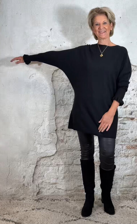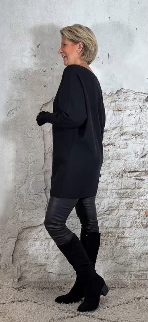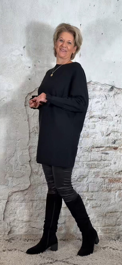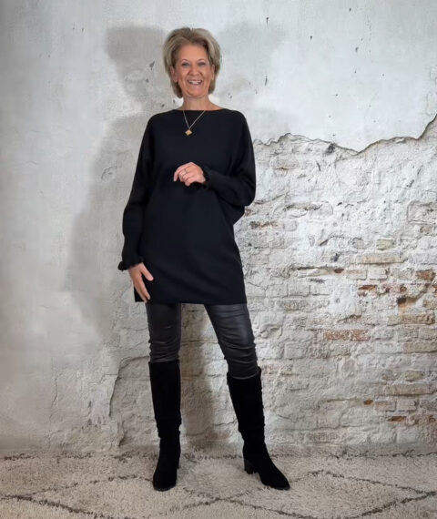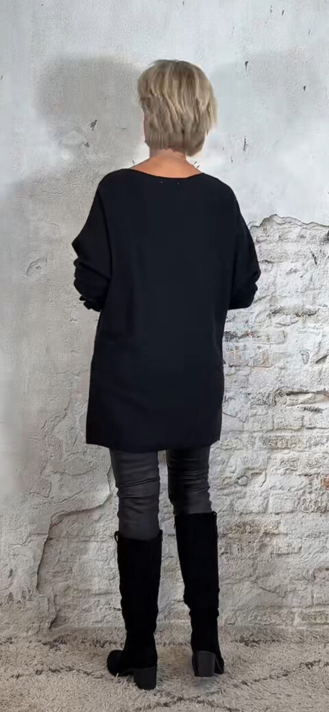 De Steffy Tuni Trui in zwart is een stijlvolle lange trui met een vrouwelijke en comfortabele pasvorm ✨
