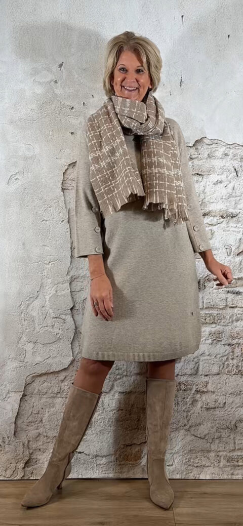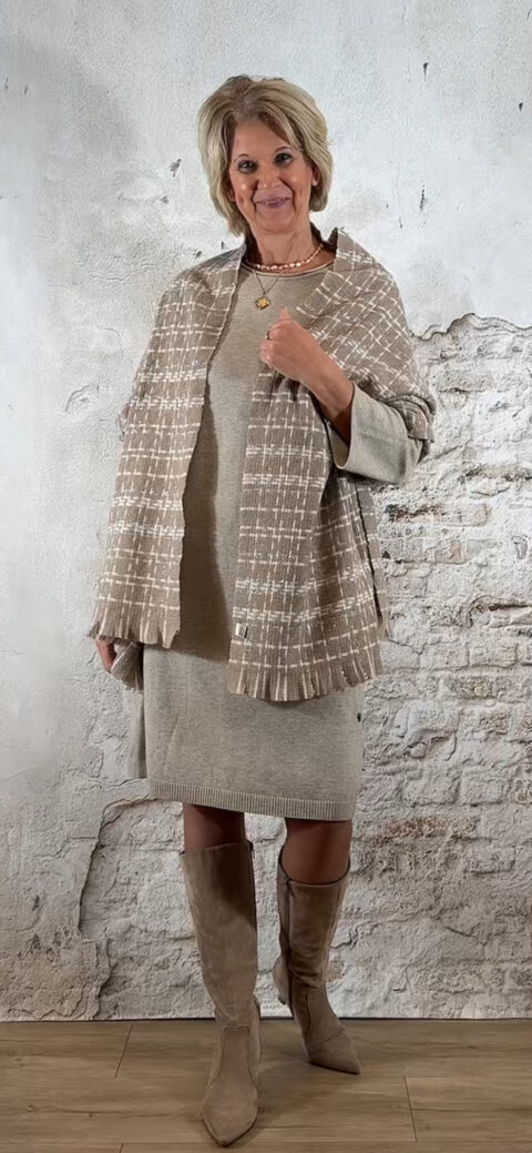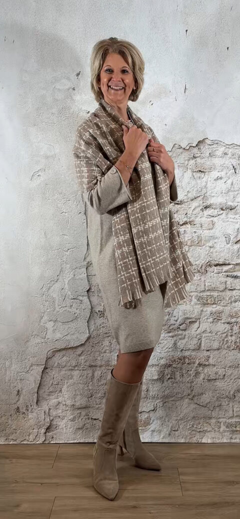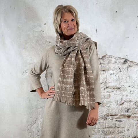 De Suus Wintersjaal in taupe–offwhite met subtiele zilverkleurige lurexdraad is zo’n rustige, verfijnde sjaal die werkelijk overal bij past. De neutrale tinten geven elke outfit een zachte, elegante uitstraling, terwijl het fijne glitterdraad net dat vleugje luxe toevoegt zonder op te vallen.