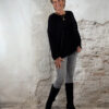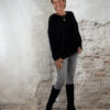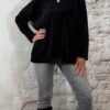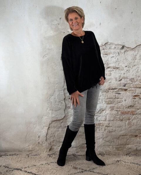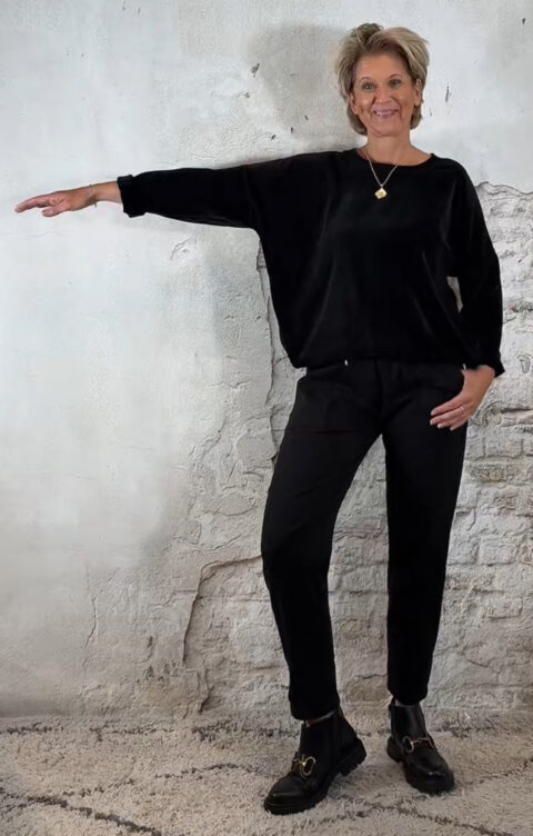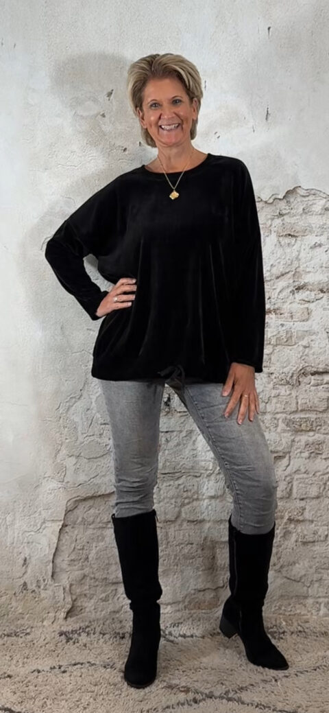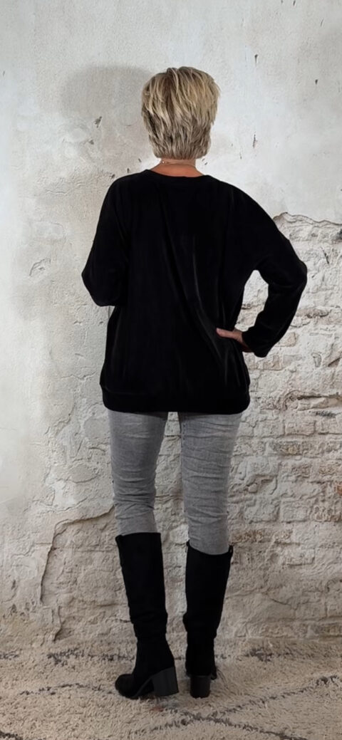 Gemaakt van een viscose-velours met elastan. Viscose zorgt voor een ademende, zachte en natuurlijke touch, terwijl het velours mooi glanst, soepel valt en kleurvast blijft. Door de mix met stretch blijft de stof bovendien mooi in de was en voelt hij niet zwaar aan , zo heb je jarenlang plezier van je sweater.