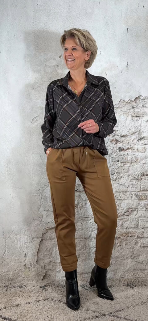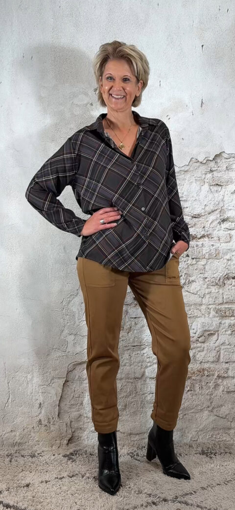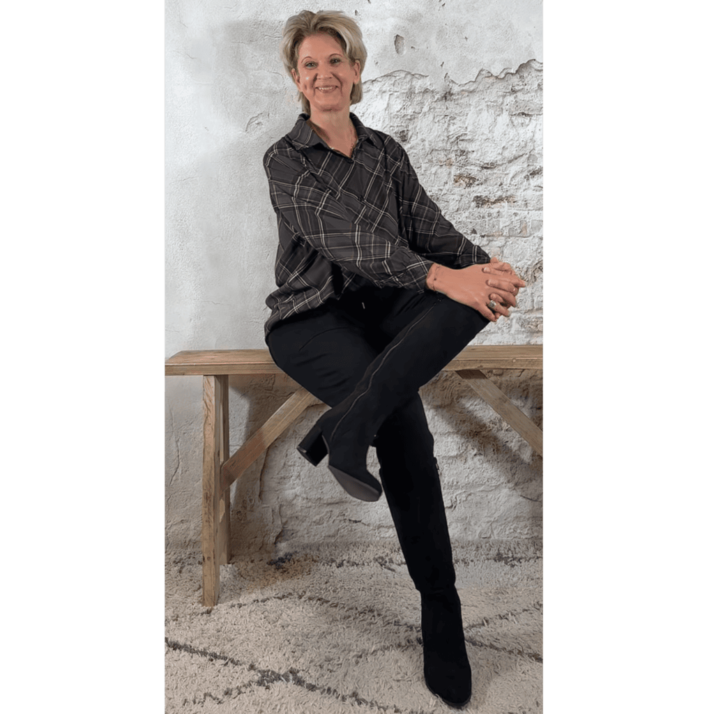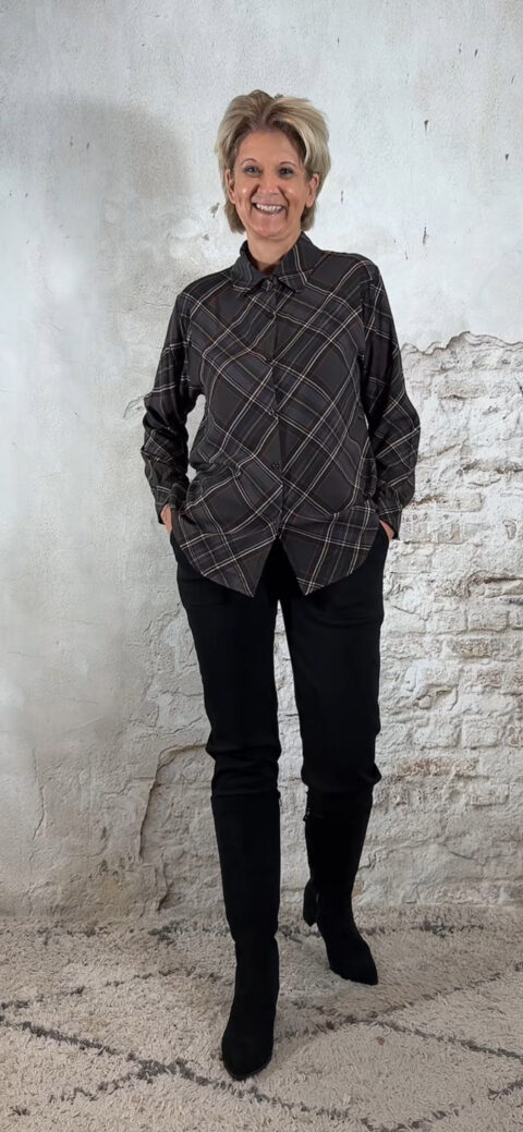 De Viscose Blouse Geruit Donkergrijs is een mooie, soepelvallende blouse met een stijlvolle ruitprint.