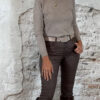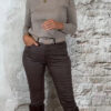Een middelhoge, aansluitende broek met knoopsluiting en een klassiek 5-pocket model. De broek heeft een zachte binnenkant en valt goed op maat, waarbij hij rond de buik iets ruimer is.