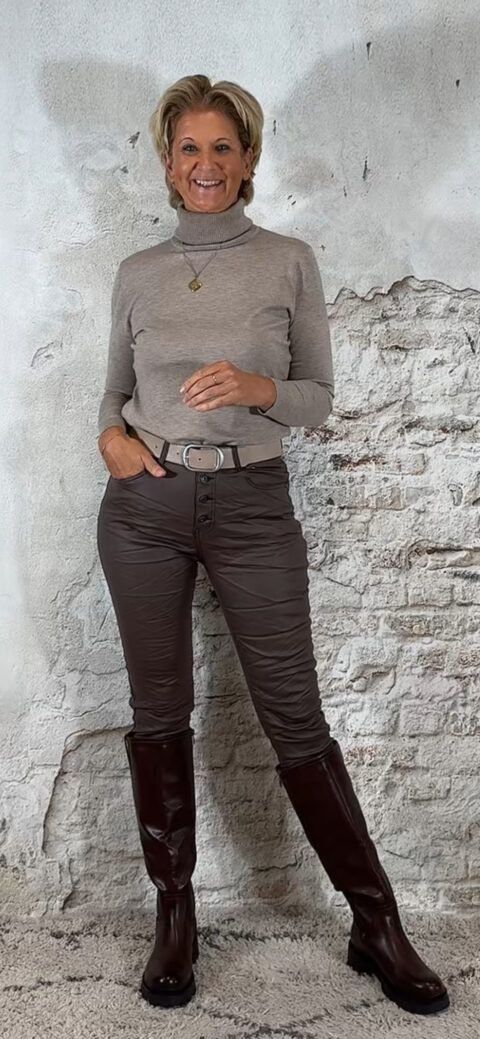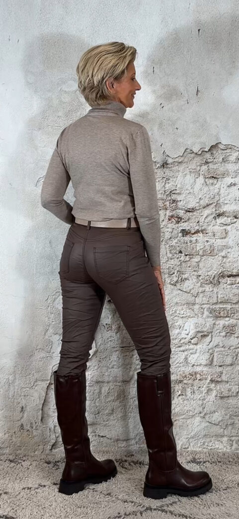 De leatherlook broek is verkrijgbaar in khakizwartbruintaupedonkerblauw