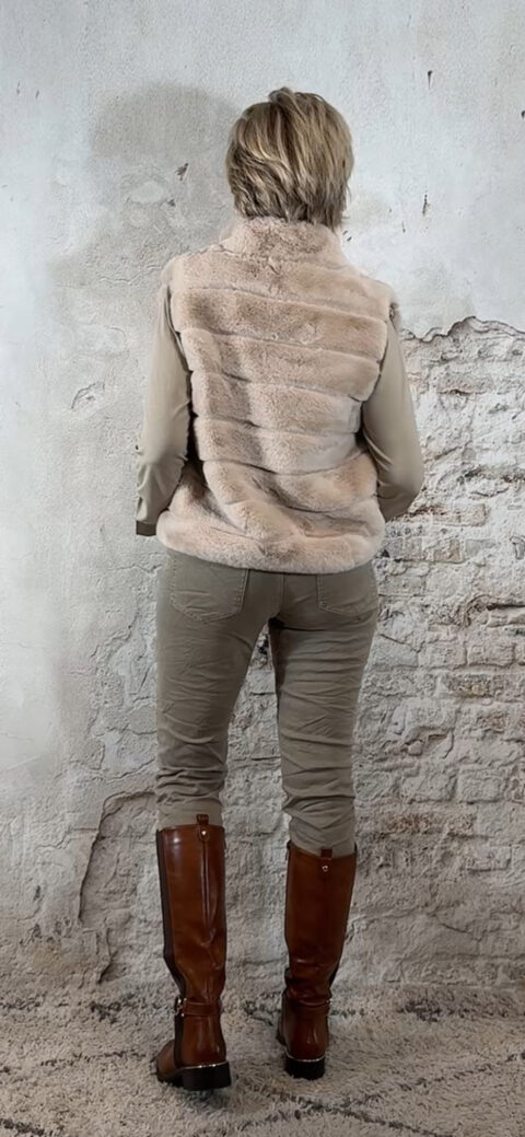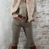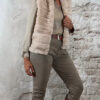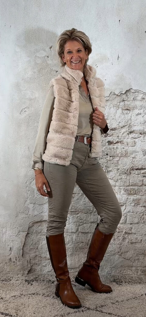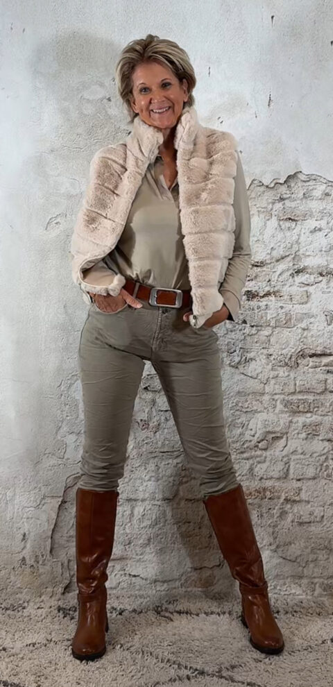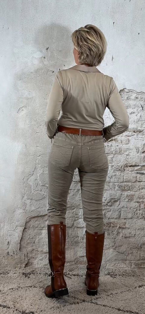 Kleuren: taupe/bruin, khaki, zand, beige, donkerblauw, ecru, wit en licht grijze jeans.