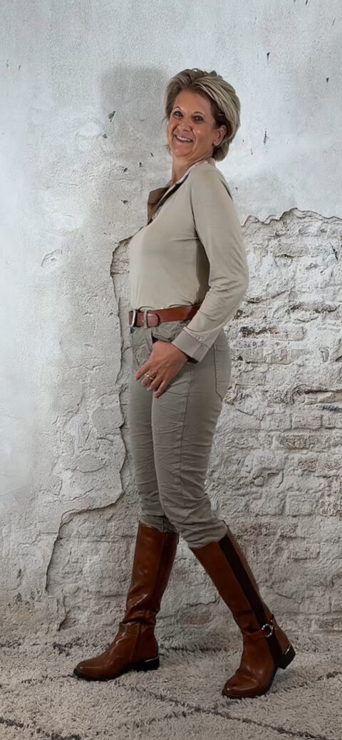 • Bij ronde heupen en vollere billen: neem een maat groter. Hij kan bij de buik dan iets losser zitten, maar met een riem valt dat niet op.