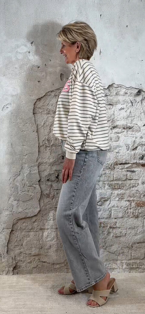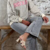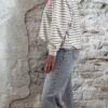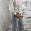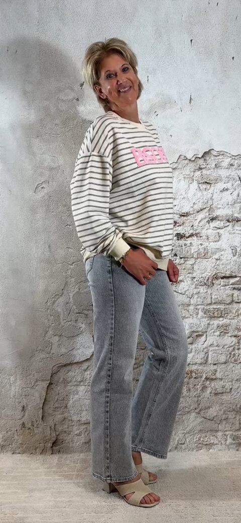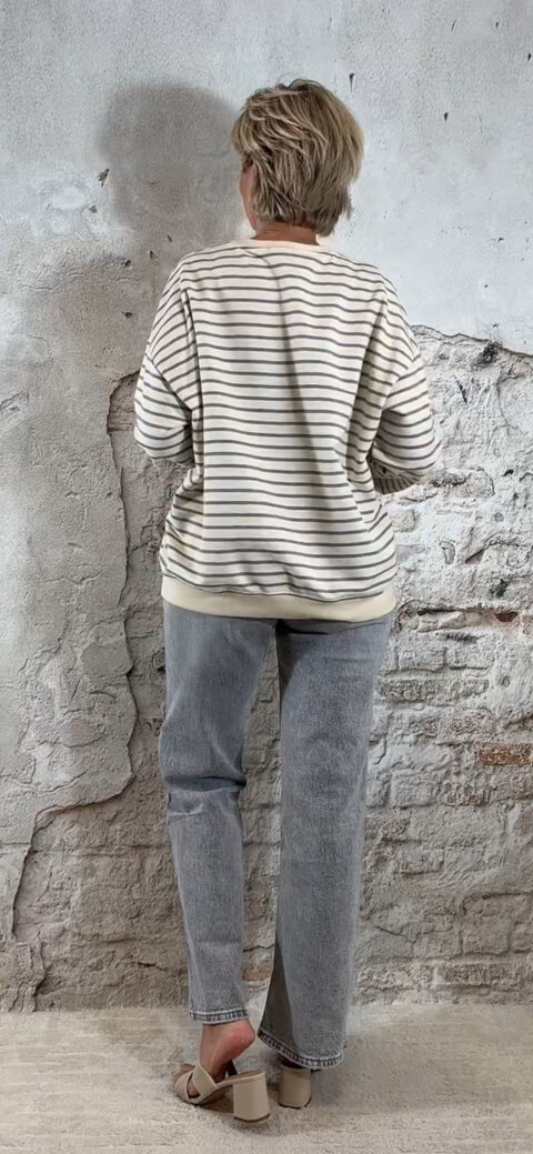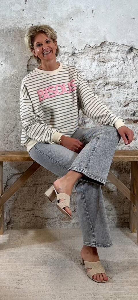 De Ailan sweater streep bisous in ecru/grijs is een frisse, speelse sweater met een zomerse uitstraling. De combinatie van ecru met grijze strepen en de subtiele “bisous” print geeft deze sweater een luchtige, vrouwelijke look.