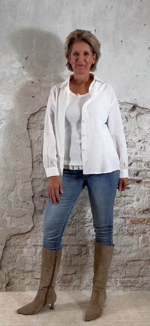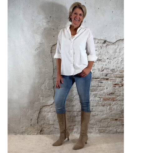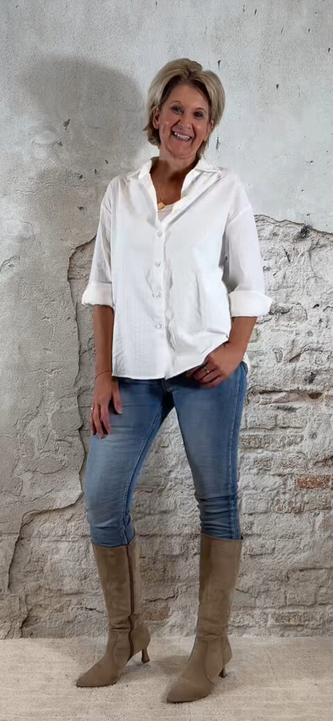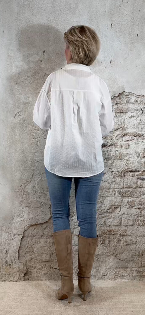 De Steffy blouse Sehr Sucre in wit is een luxe, frisse musthave die je het hele jaar door kunt dragen. De subtiele ingeweven strepen met bobbel-effect geven de blouse een chique, rijke structuur — elegant zonder dat het te veel wordt. Het model valt heerlijk oversized, heeft een nette afwerking en straalt pure klasse uit.