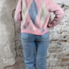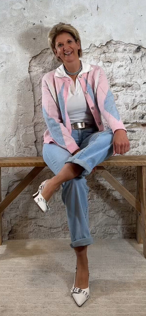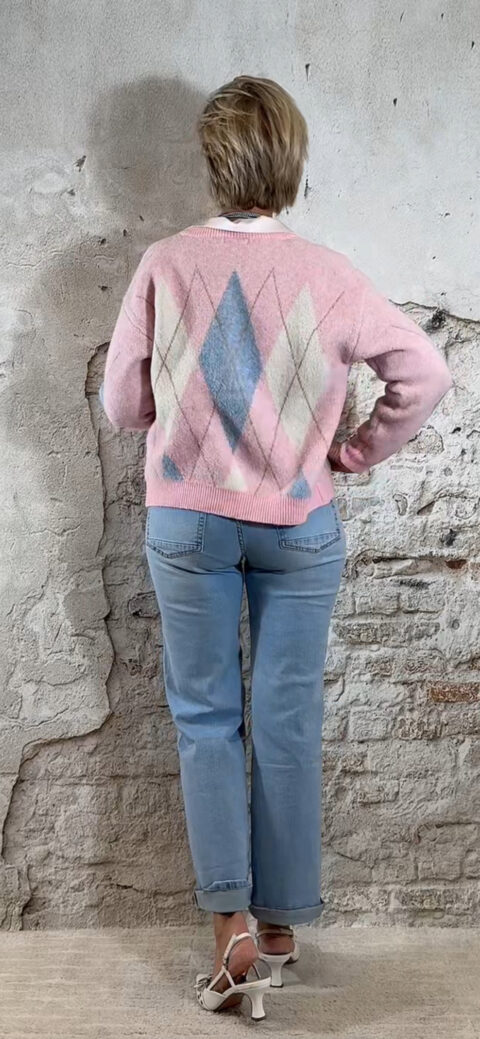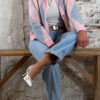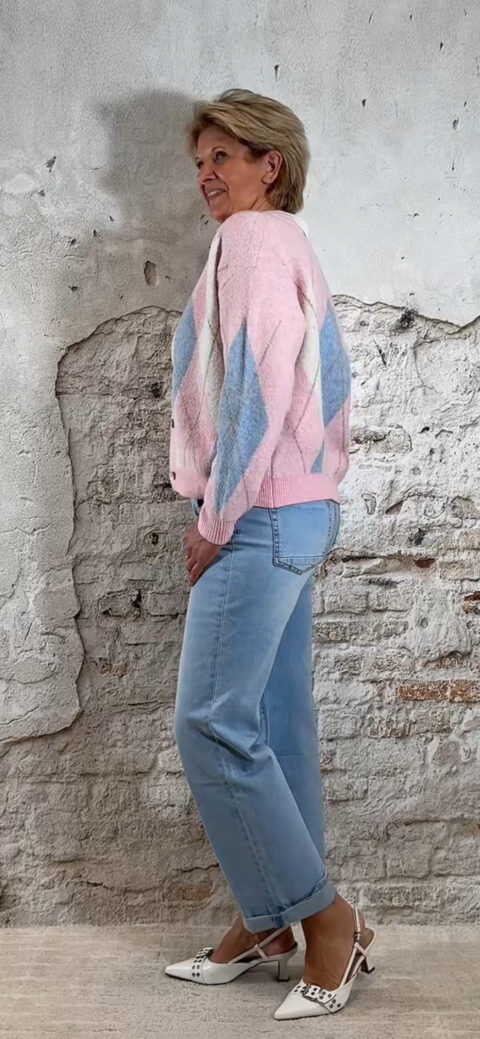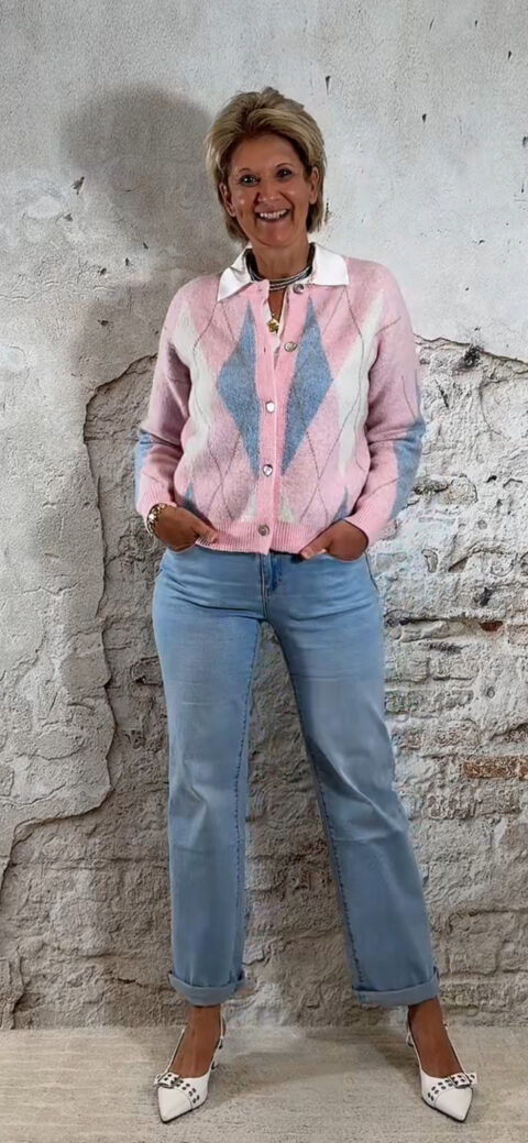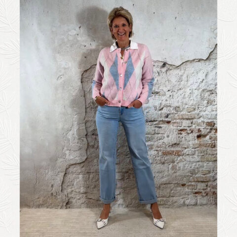 De Steffy lente vest ruit in roze is een vrolijk en vrouwelijk vest dat perfect past bij het voorjaar. Het ruitmotief geeft het vest een speelse uitstraling en de zachte roze tint zorgt voor een frisse, lichte look die meteen opvalt zonder schreeuwerig te zijn.