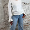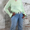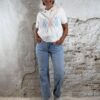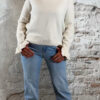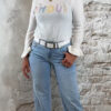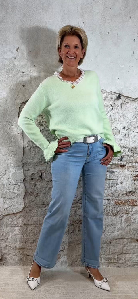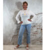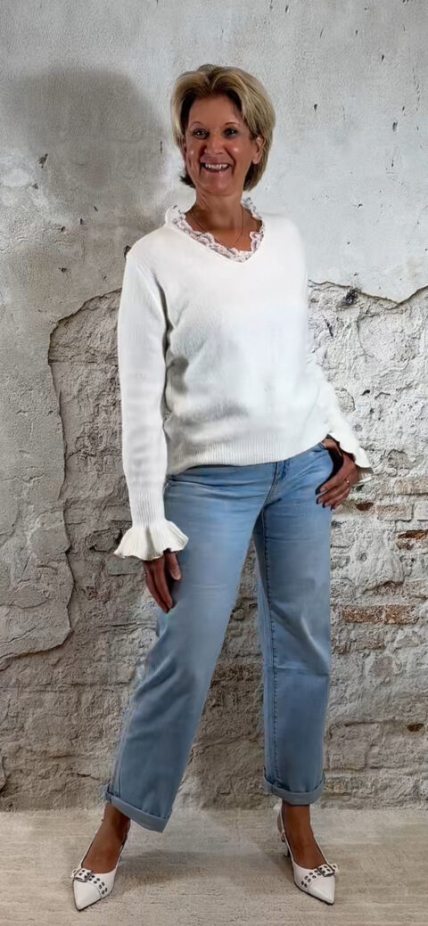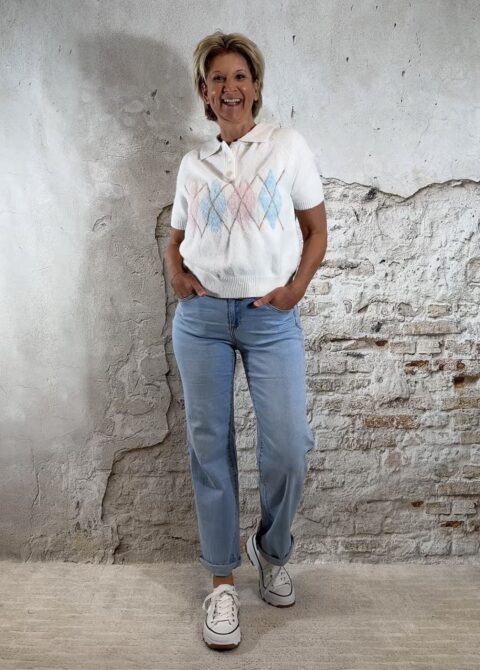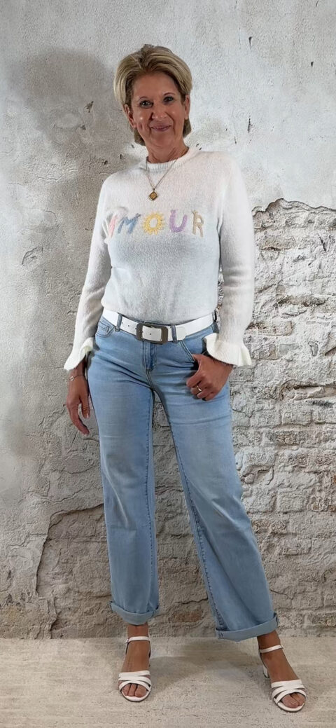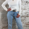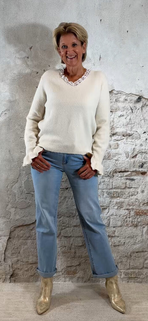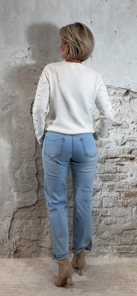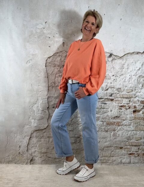 De jeans bevat stretch en draagt daardoor comfortabel. Let op de pasvorm bij de taille: deze valt wat ruimer. Je kunt kiezen voor een maat kleiner of werken met een riem. Nancy kiest zelf voor iets meer ruimte in de taille met een riem, maar in de winkel wordt vaak gekozen voor een maat kleiner.