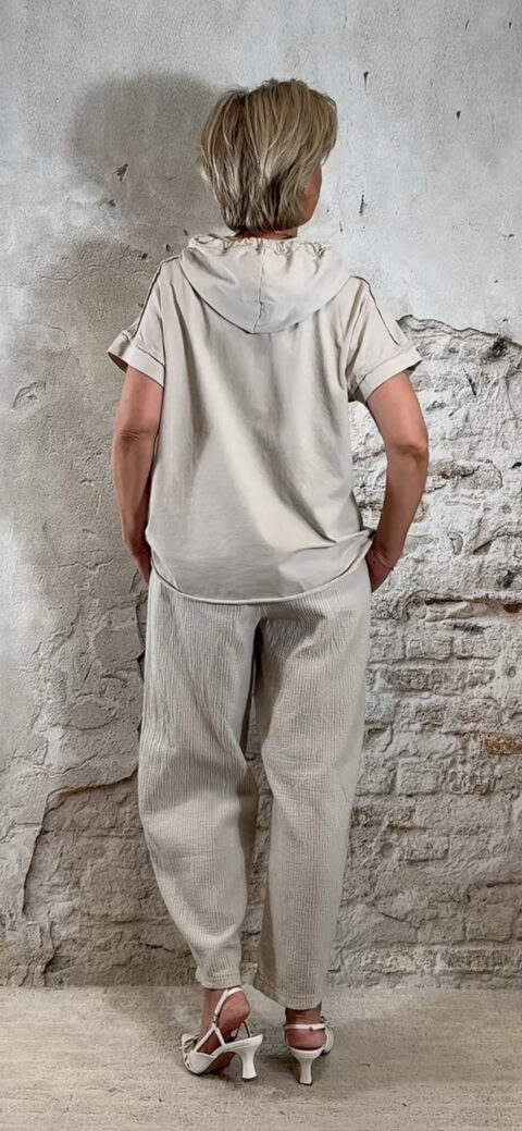 De hoodie heeft korte mouwen en een capuchon met koordjes, wat zorgt voor een casual en moderne look. De achterkant is effen, waardoor de voorkant extra opvalt.
