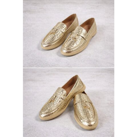 Deze gevlochten loafer in goud is de perfecte combinatie van klassiek en modern. Het gevlochten patroon geeft de loafer een luxe en verfijnde uitstraling, terwijl het sierbandje aan de voorkant met een lusje en subtiele sierhangertjes zorgt voor een speels en stijlvol detail.