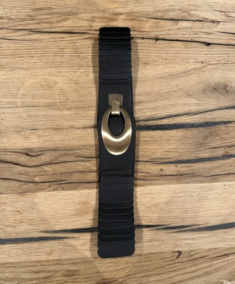 94081. Elastische riem zwart met gouden ovale gesp (1 april weer op voorraad, je kunt al bestellen)