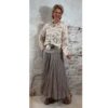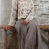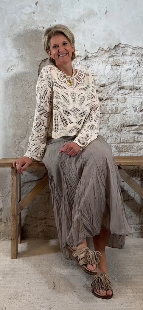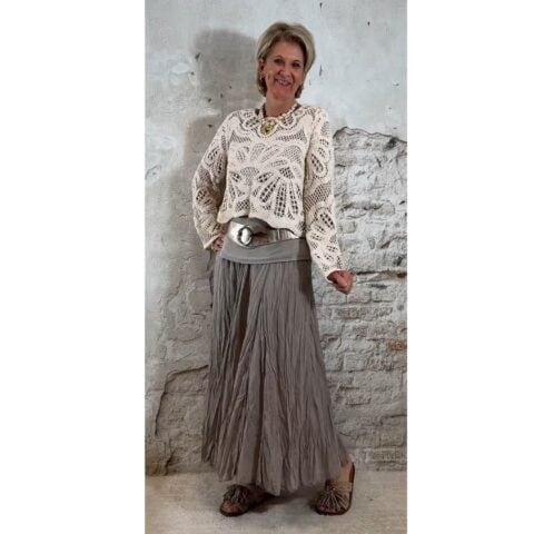 De rok is volledig gevoerd met een onderrok van dezelfde dunne katoen, waardoor hij niet doorschijnt en mooi valt. De bovenkant is afgewerkt met een brede gebreide boord die omgeslagen is. Hierdoor zit de rok comfortabel en kun je spelen met de lengte door hem wat hoger of lager te dragen. Het is een echte maxi rok, en hoe langer hoe beter.