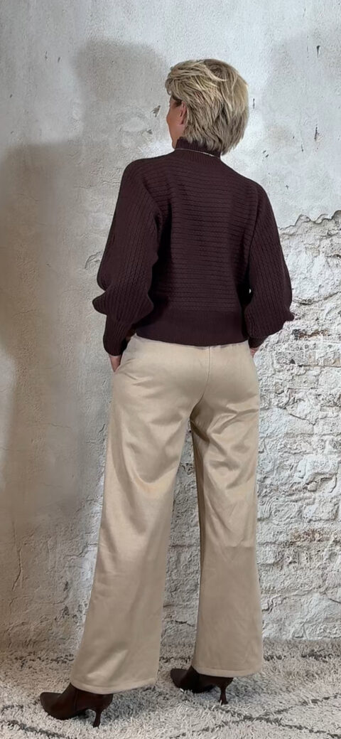 De horizontale kabels en de turtle hals geven hem een stijlvolle look, terwijl de vlindermouw met lichte pof zorgt voor een vrouwelijke twist.