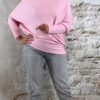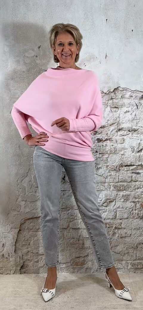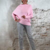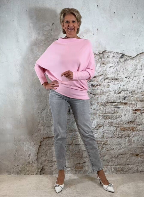 De Ailan Upside Down Pullover in licht roze is een speelse, moderne knit die je op twee manieren kunt dragen. De boothals valt zacht en licht geplooid, en de trui loopt zowel voor als achter schuin af. Onderaan sluit hij subtiel aan, waardoor het model vanzelf elegant bloused.