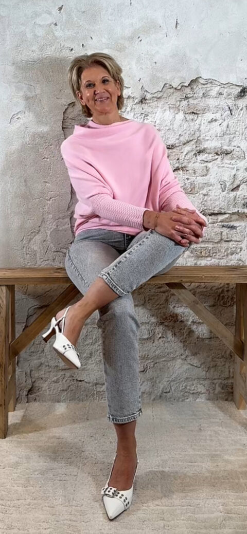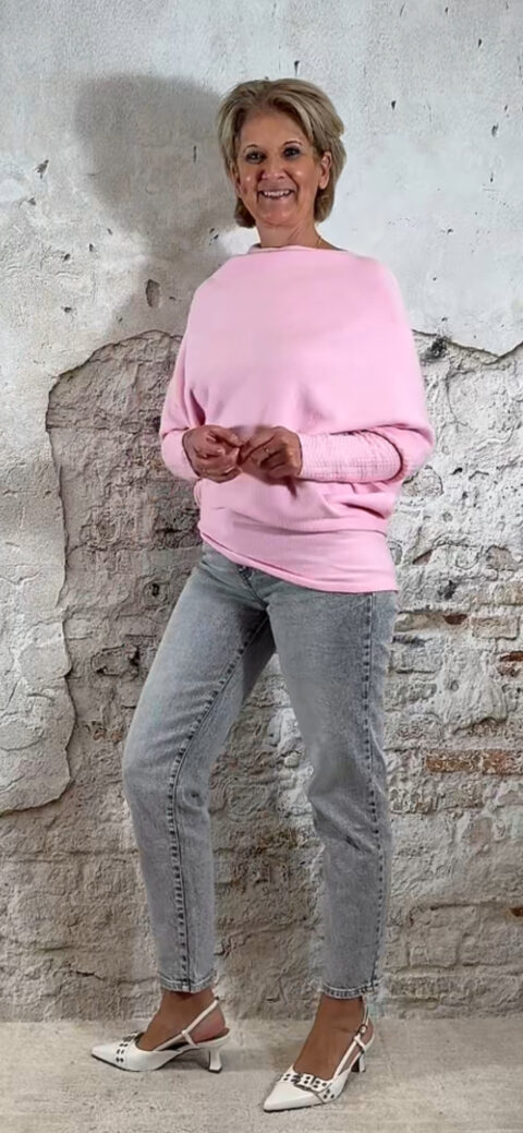 Draai je de trui ondersteboven, dan wordt het een stijlvolle off-shoulder knit — perfect voor een avondlook of een speelse, vrouwelijke twist. De lange manchetmouwen maken de trui extra chic en slank.