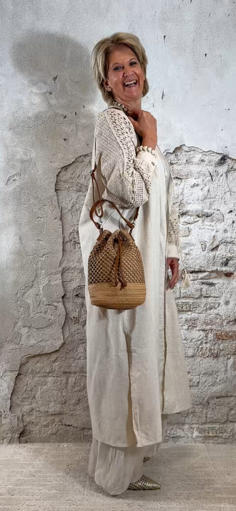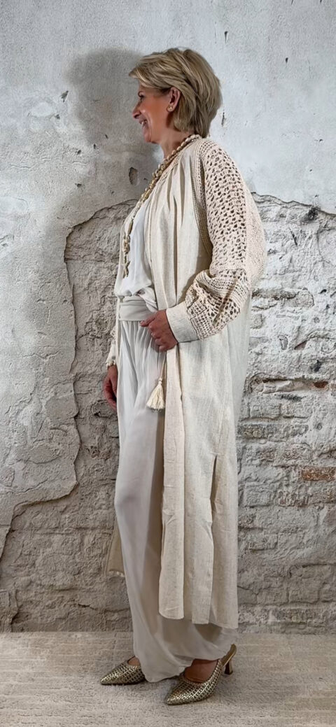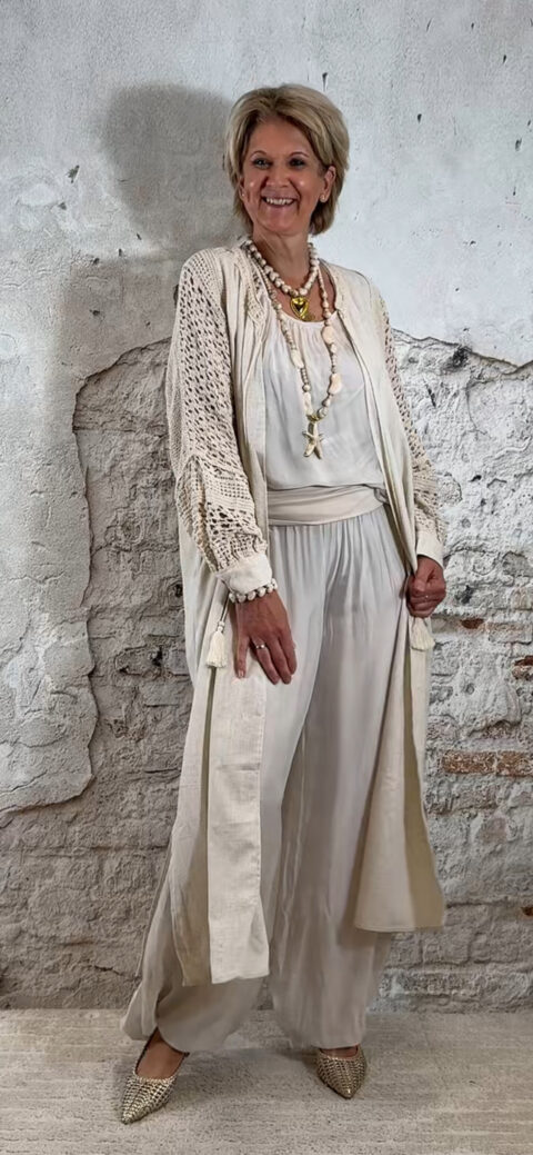 Het ballonmodel geeft de broek een speels en trendy silhouet, terwijl de stof elegant meebeweegt met elke stap. De broek valt relatief lang en is niet in te korten vanwege het ballonmodel, wat juist zorgt voor die typische nonchalante Ibiza-look.