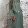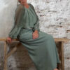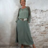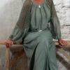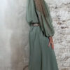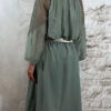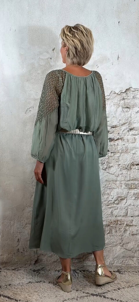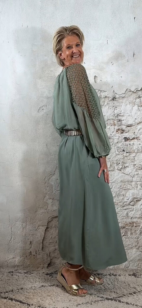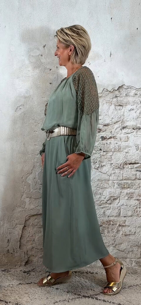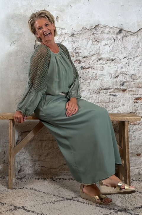 De wijde mouw is afgewerkt met kant en afgebiesd aan de onderkant, zodat hij mooi valt als een lichte ballonmouw. De ronde hals is aangerimpeld voor een nonchalante, romantische touch.
