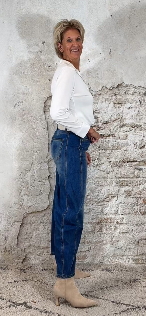 Het model heeft een hoge taille en een ingezette bies opzij, wat zorgt voor die kenmerkende ballonvorm: aangesloten boven, wijd op de benen en onderaan licht toelopend.