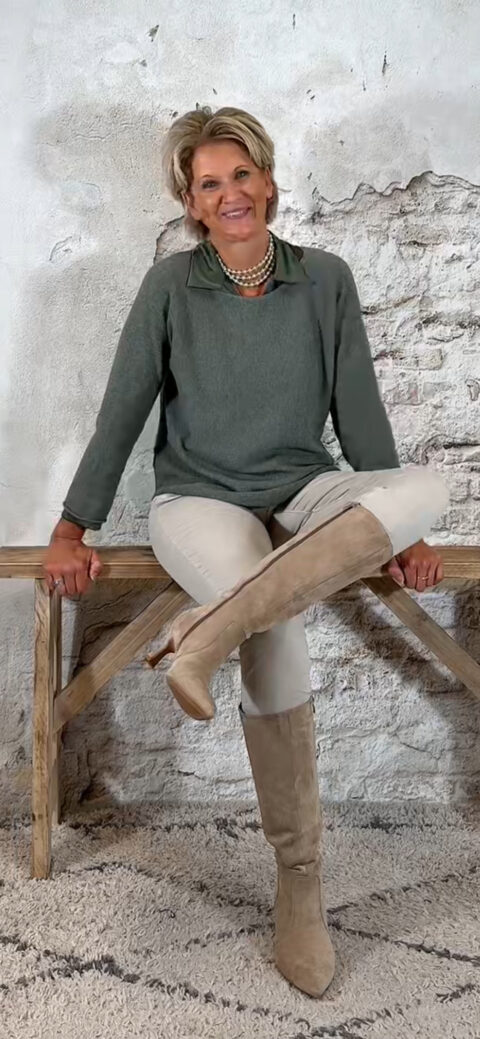 Bibi basic pullover in khaki met ronde hals, nonchalante afwerking en licht ronde onderkant. Zachte viscosemix. One size 36 t/m kleine 42.
