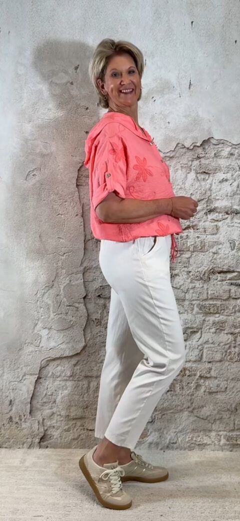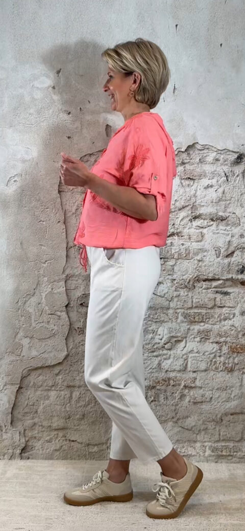 De Bibi casual hoodie blouse met koord is sportief, vrouwelijk en verrassend gedetailleerd. Deze blouse combineert het comfort van een hoodie met de uitstraling van een luchtige blouse. De geborduurde bloemen op de voorkant en op de capuchon geven haar een speelse en zomerse touch.
