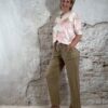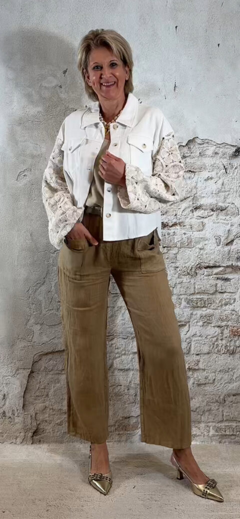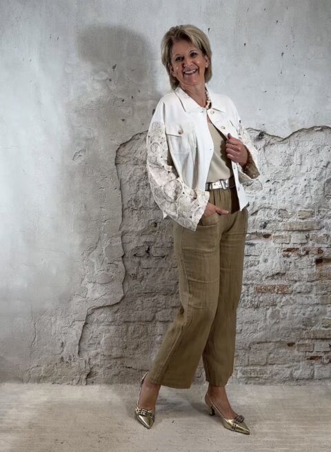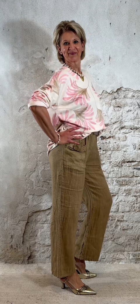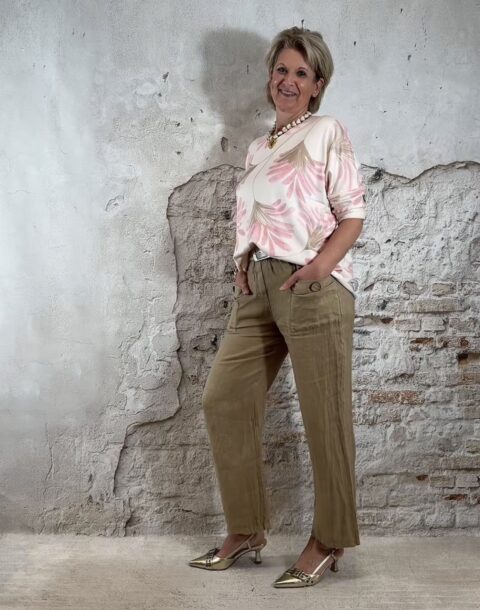 Het model heeft een rechte pijp en een comfortabele pasvorm. Linnen loopt altijd nog een beetje uit.