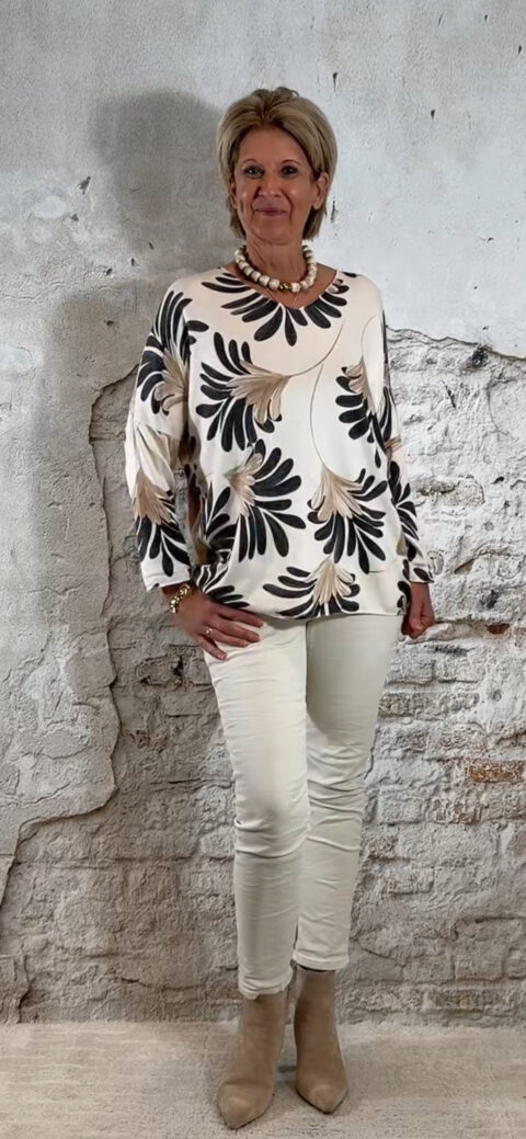 Dunne oversized pullover met bladerenprint en afgelokte randjes. Zacht breisel. Verkrijgbaar in jeansblauw, roze en antraciet. One size 38–42. €24,95.