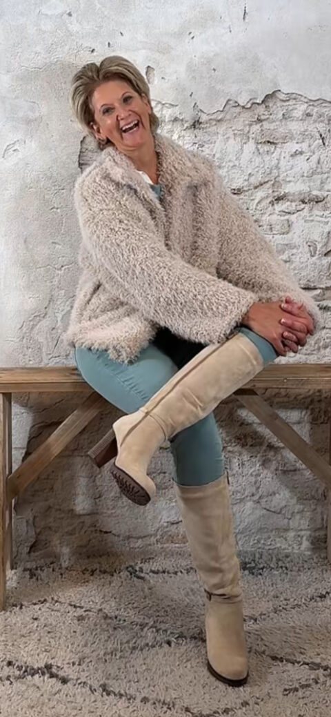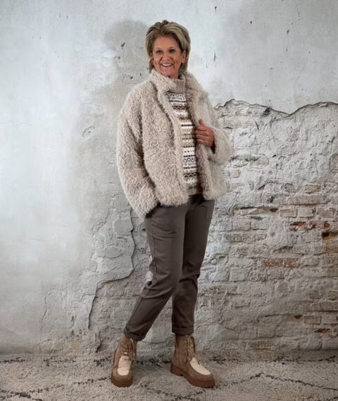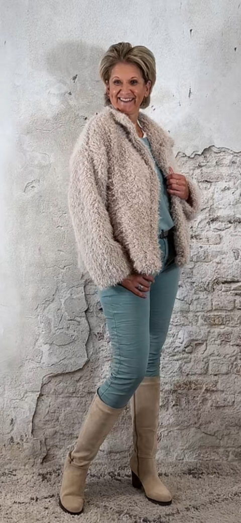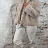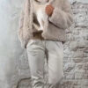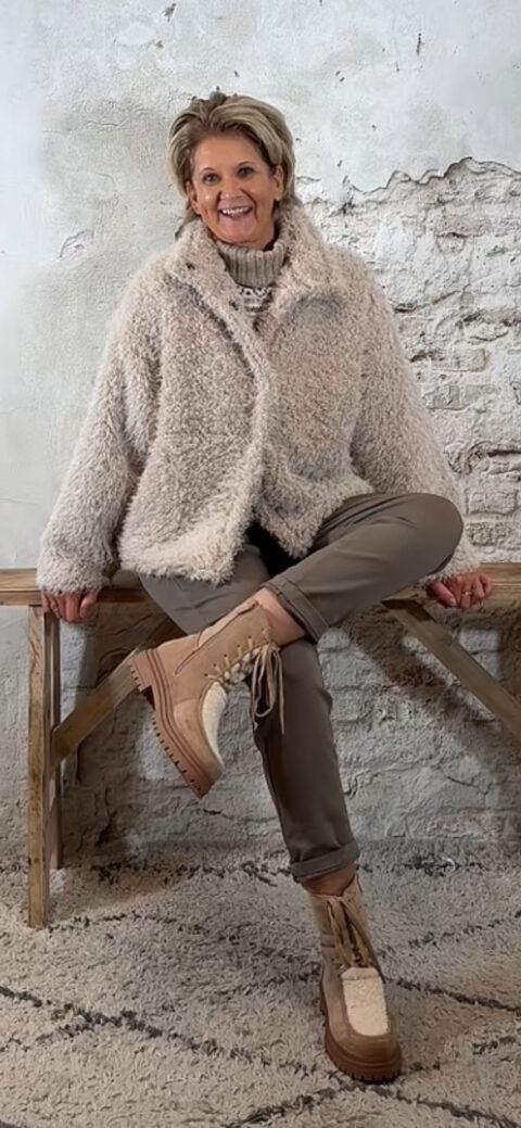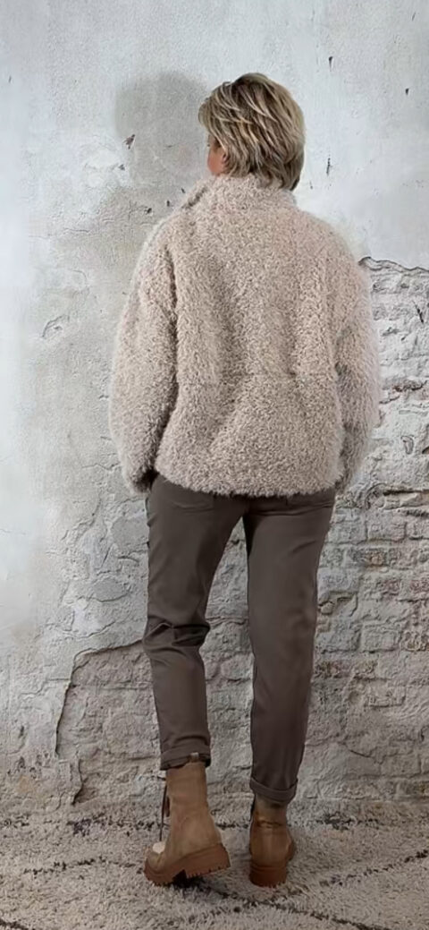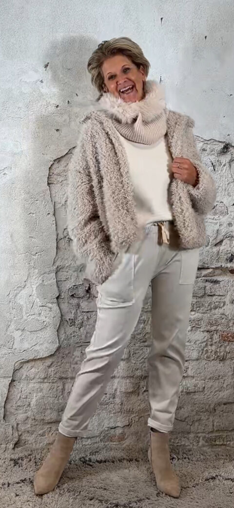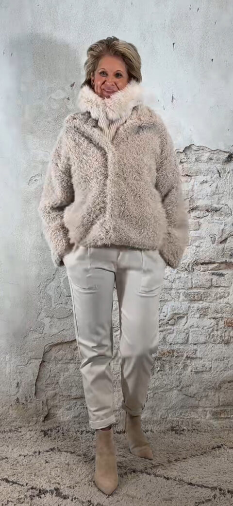 De stof heeft een knit fur-effect dat aanvoelt als zacht bont, maar is volledig gebreid — comfortabel, warm en elegant tegelijk.
